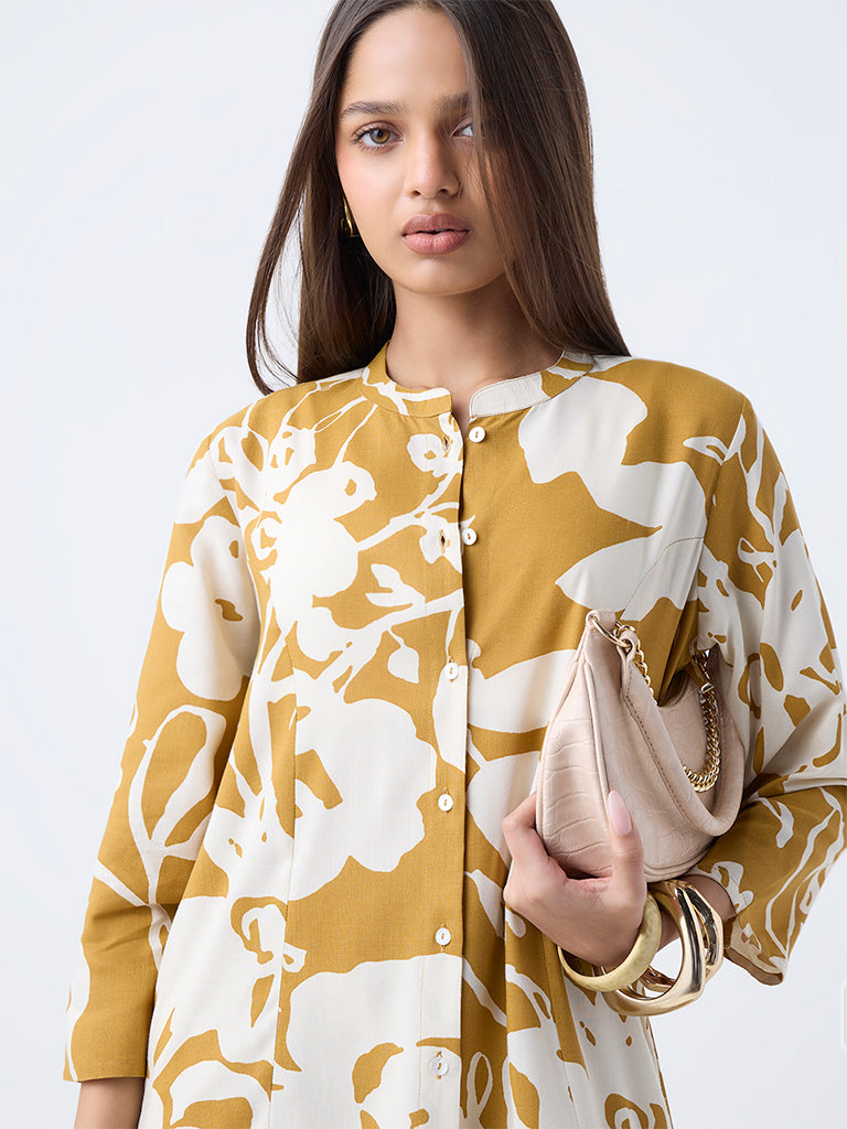 Infused with soft botanical motifs. this mustard A-line kurta from Utsa redefines everyday elegance. The band-neck collar and button placket lend it a structured charm. while 3/4th sleeves and side pockets keep it functional and fuss-free.