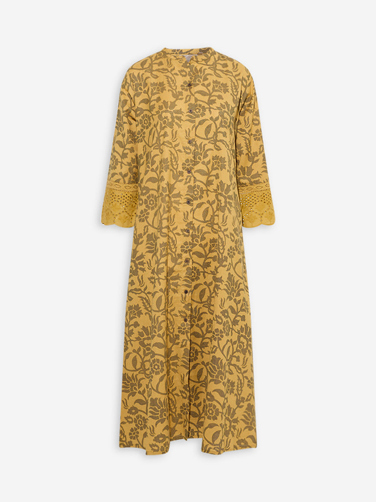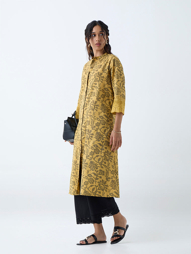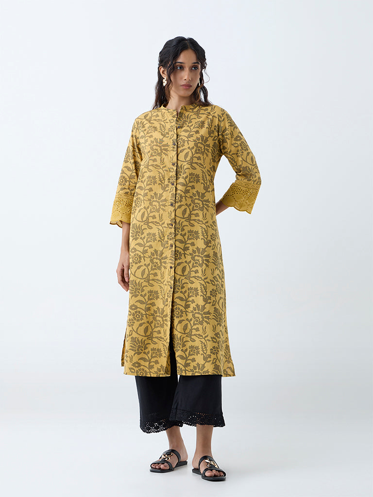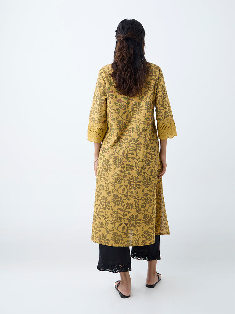 Utsa Mustard Floral Design Cotton-Blend A-Line Kurta