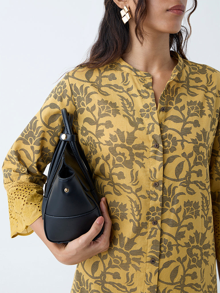 This mustard kurta from Utsa is decorated with floral prints. Tailored from a sumptuous cotton-blend fabric in a flattering A-Line silhouette. it features a mandarin collar. button placket. and three-quarter sleeves with crochet trims. A discreet slip pocket adds functionality to this stylish essential.