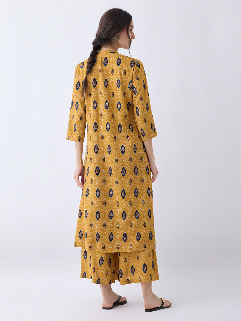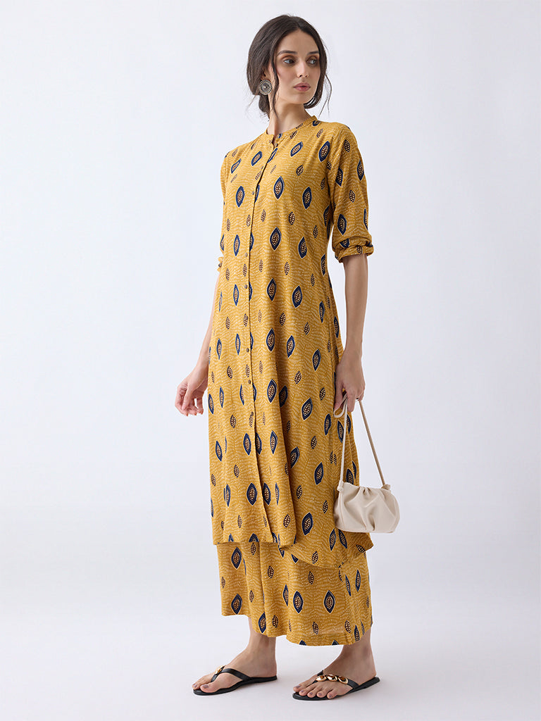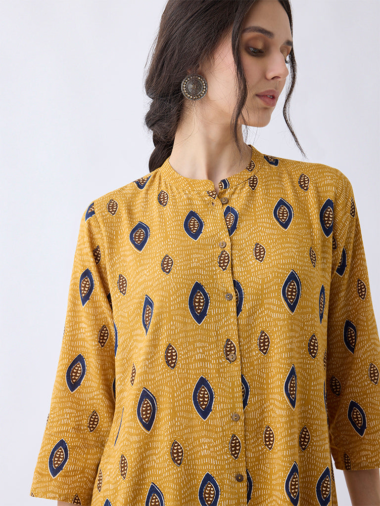 Utsa presents this mustard kurta featuring vivid abstract prints paired with anar motifs that lend a distinct ethnic character. Cut in an A-line silhouette. it’s styled with a band collar. button-up front and full sleeves. Crafted from premium blend fabric. the design highlights its bold patterns while keeping comfort in focus.