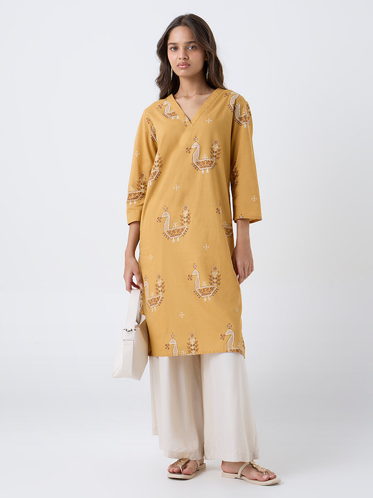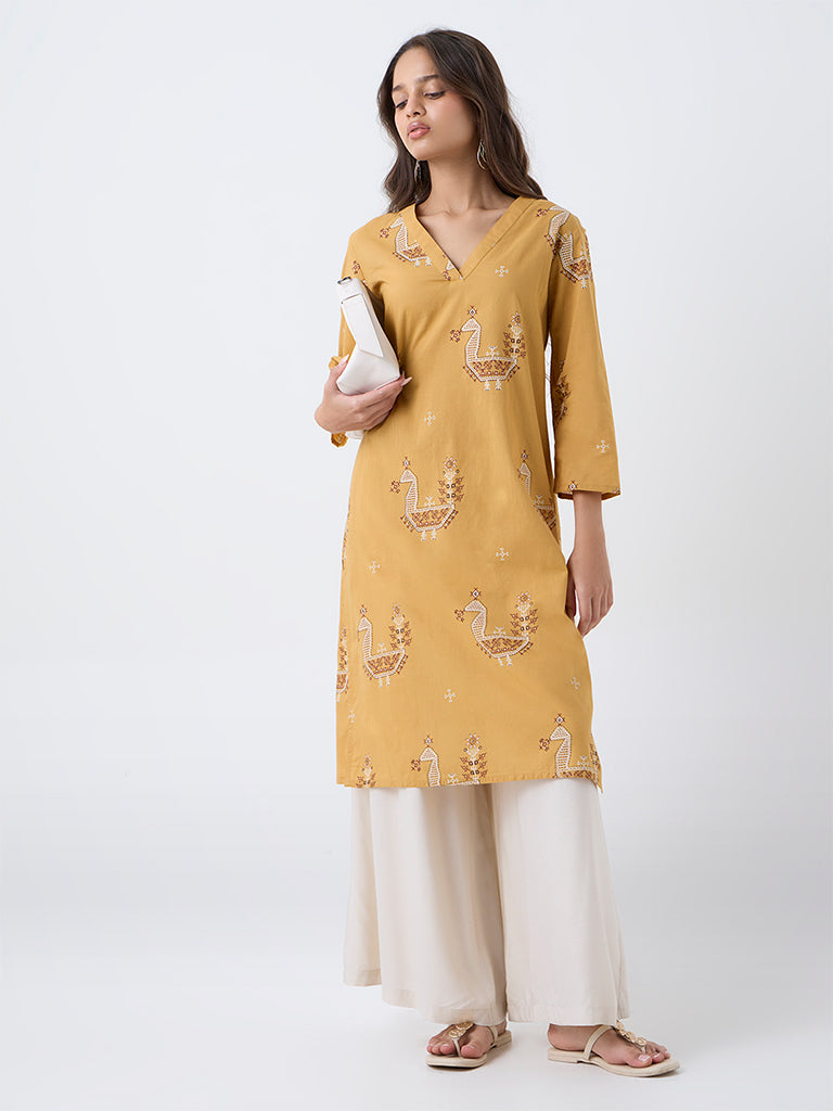 Artful and distinctive. this mustard kurta from Utsa celebrates traditional artistry through intricate peacock motifs. Structured in a straight silhouette from a cotton-rich fabric. it’s framed with a V-neck and three-quarter sleeves that balance comfort with poise.