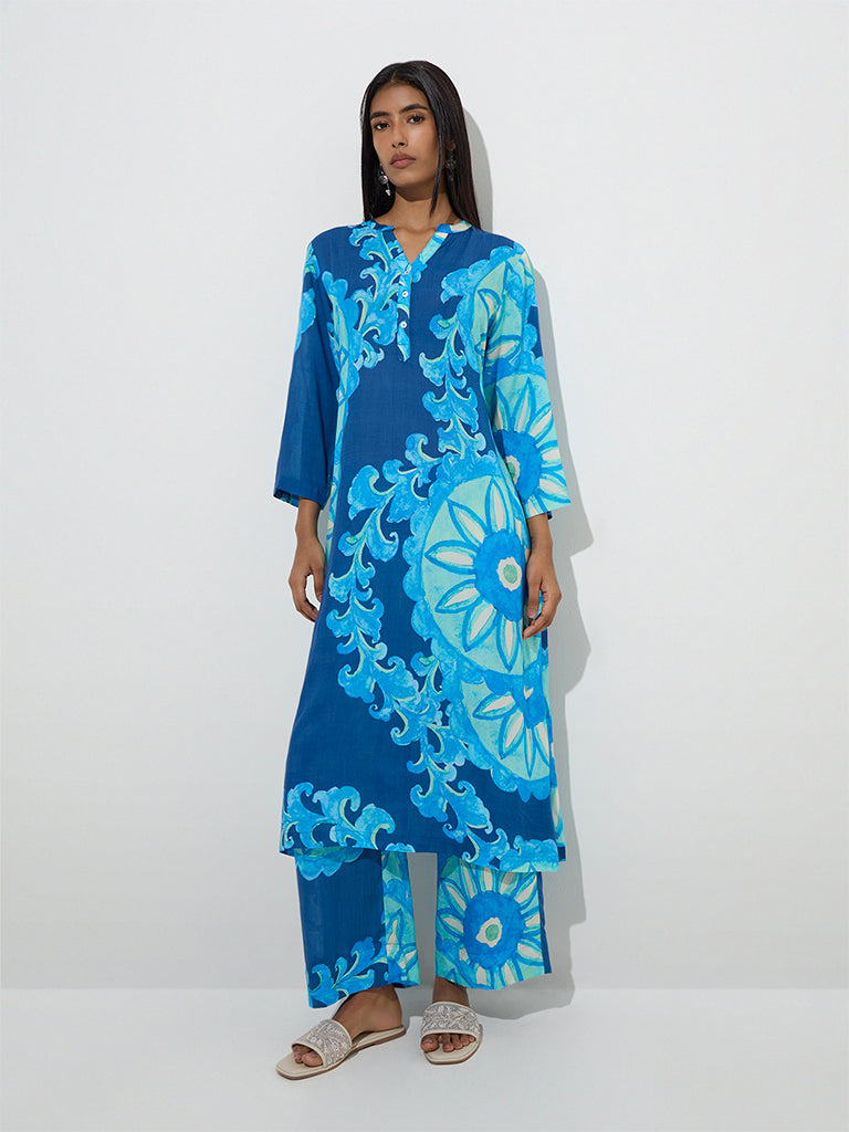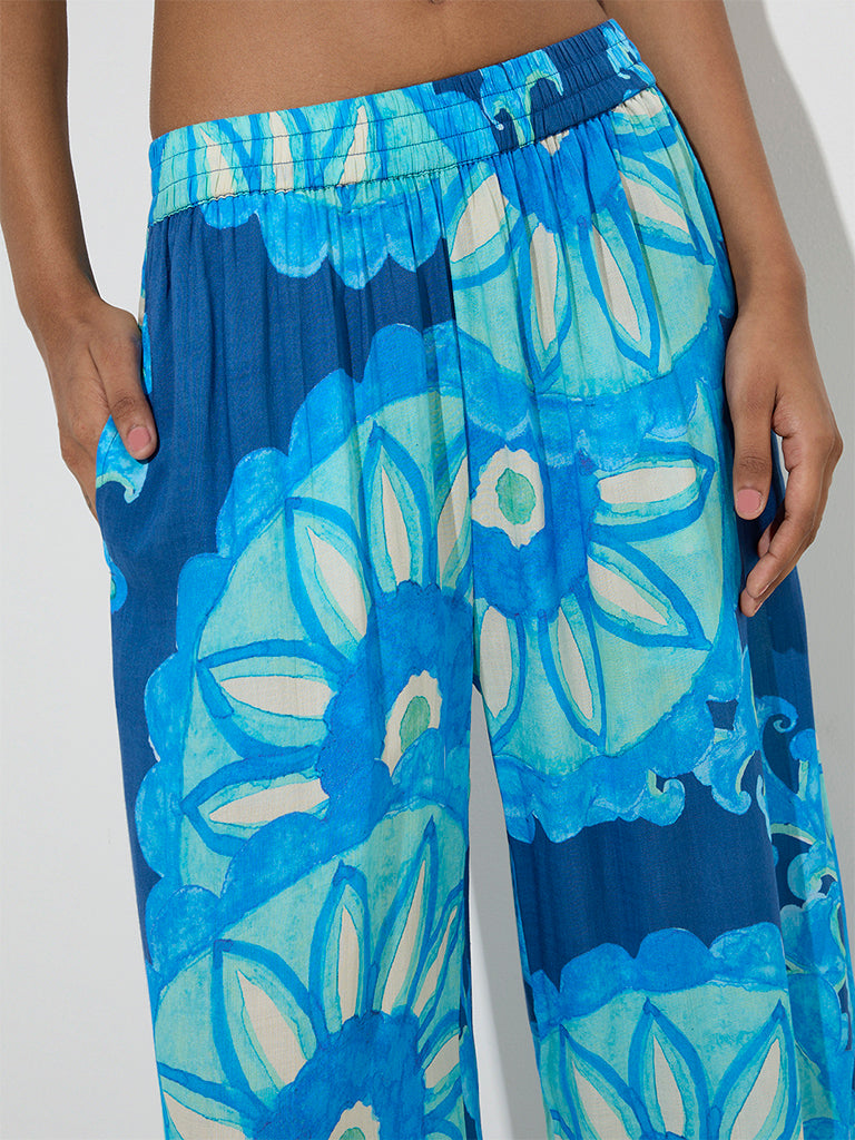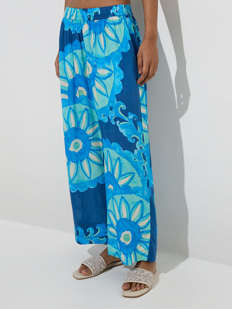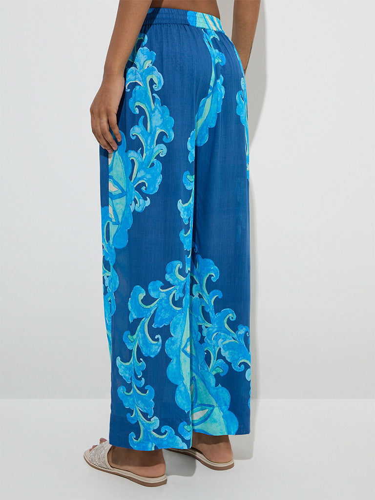 Utsa Navy Foliage Patterned Ethnic Pants