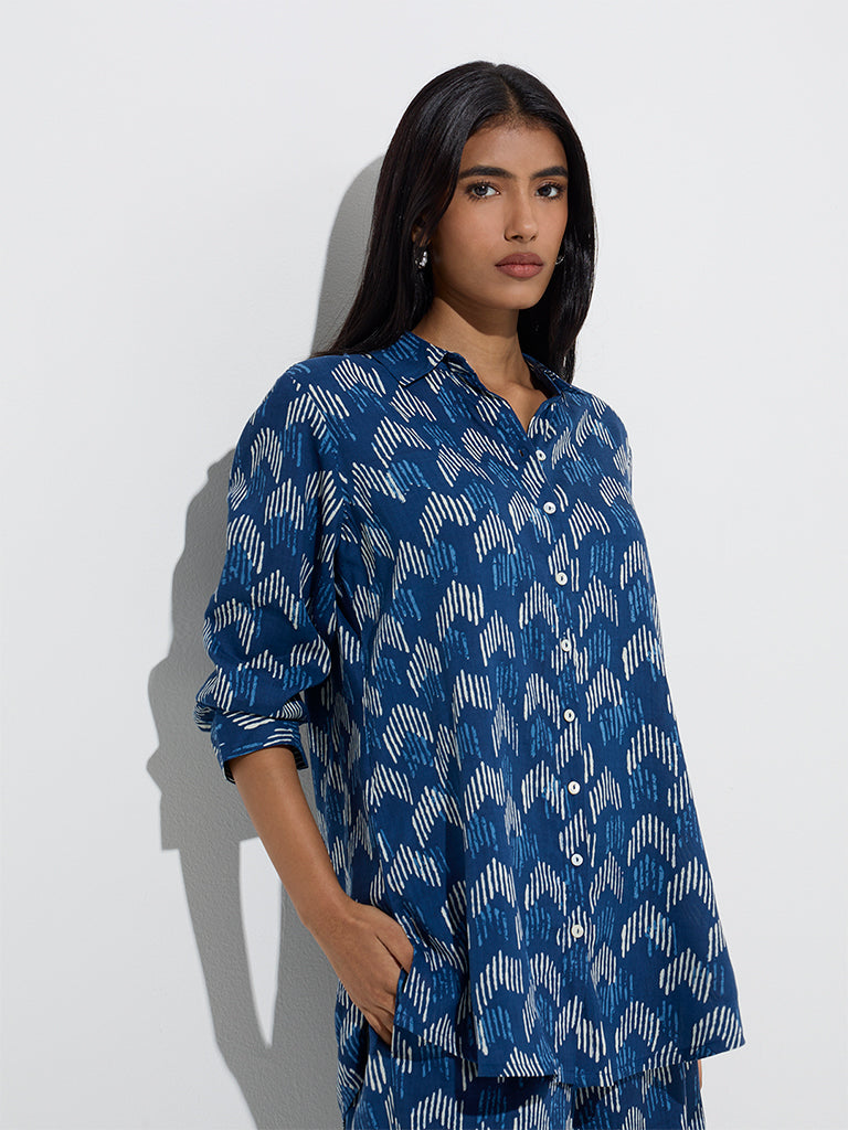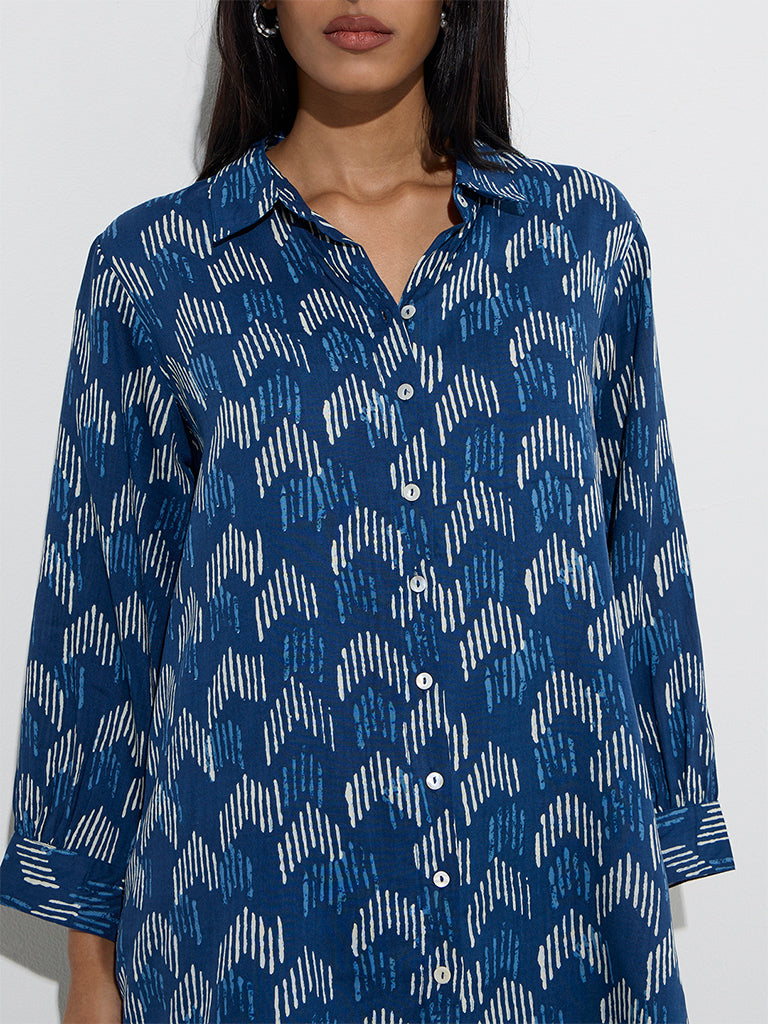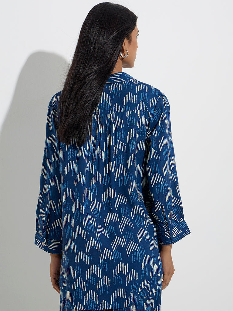 This navy tunic from Utsa showcases intricate white and blue prints for a striking contrast. Styled with a spread collar. button-down front. and full sleeves. it’s finished with a high-low hemline that adds a modern twist to the classic silhouette.
