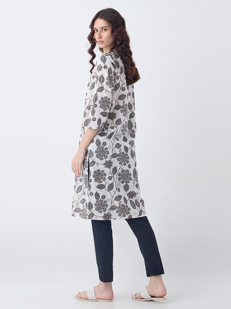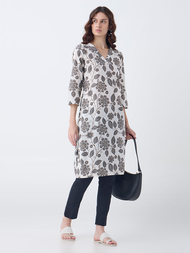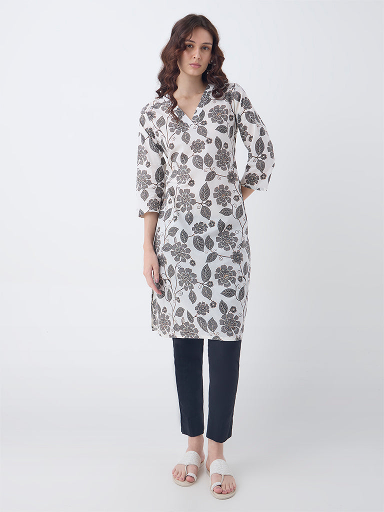 Utsa Off-White Botanical Design Cotton Straight Kurta