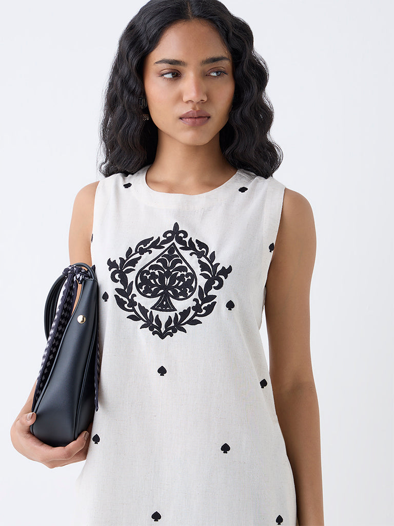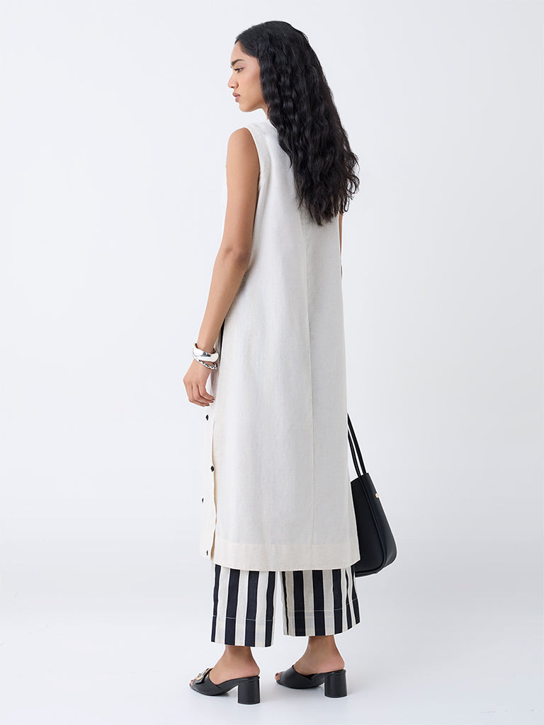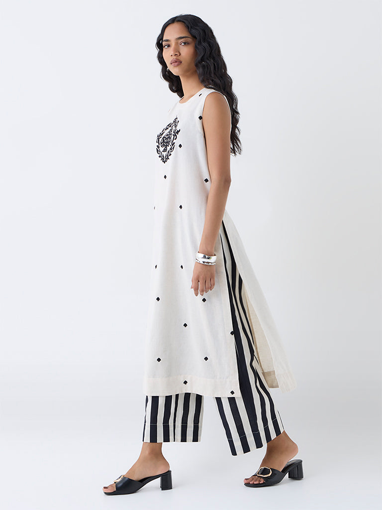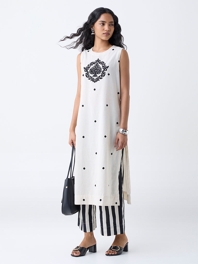 An elegant staple for everyday wear. this off-white kurta from Utsa is tailored in an A-line silhouette. The round neckline and sleeveless design keep it light and versatile. while delicate embroidery adds a refined touch. A timeless piece that pairs effortlessly with both palazzos and ethnic pants.