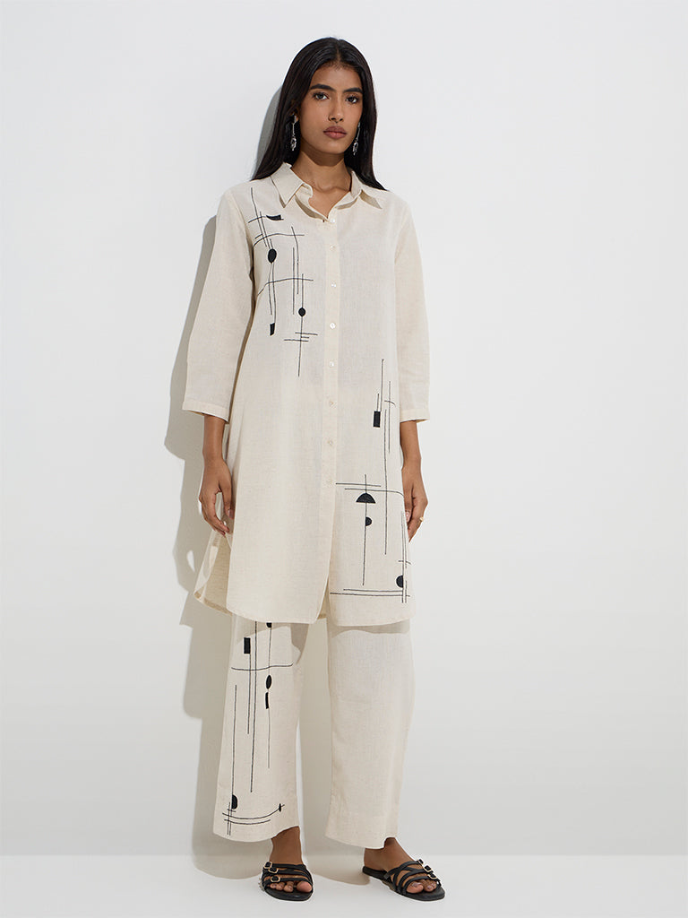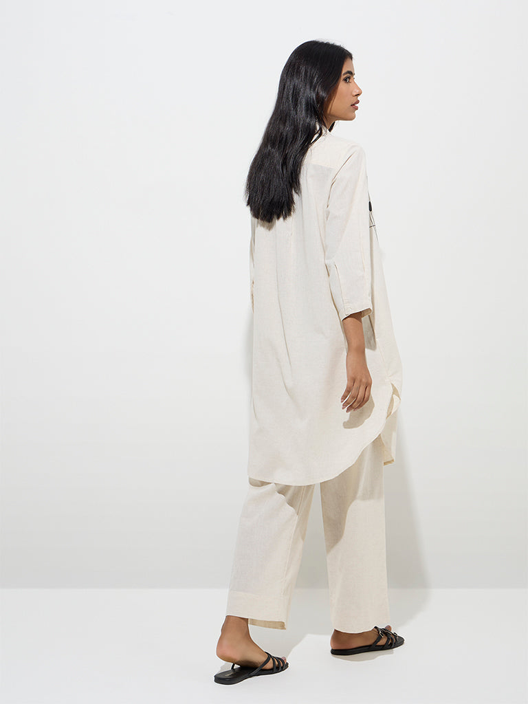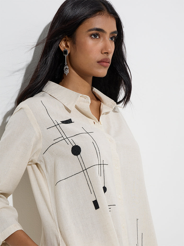This off-white A-line kurta from Utsa is crafted from a soft cotton blend and features delicate embroidery for a refined look. Designed with a spread collar. button-down front. and three-quatres sleeves. it’s finished with side pockets and a curved hemline that adds a graceful touch to the silhouette.