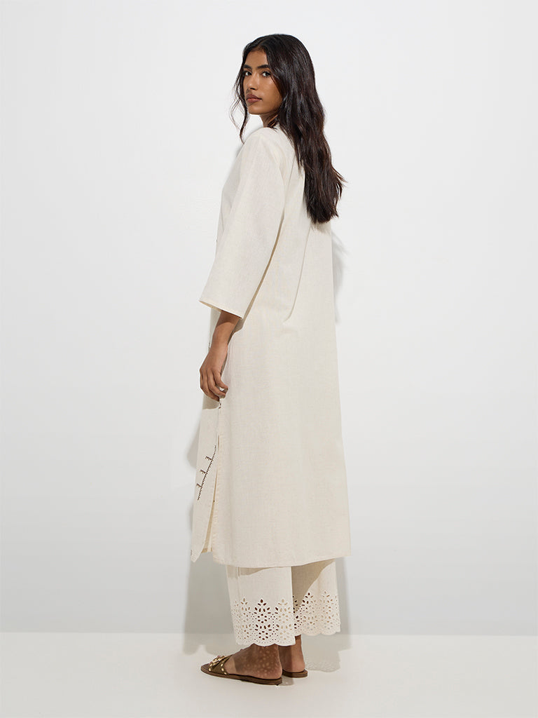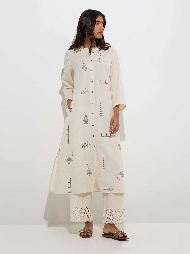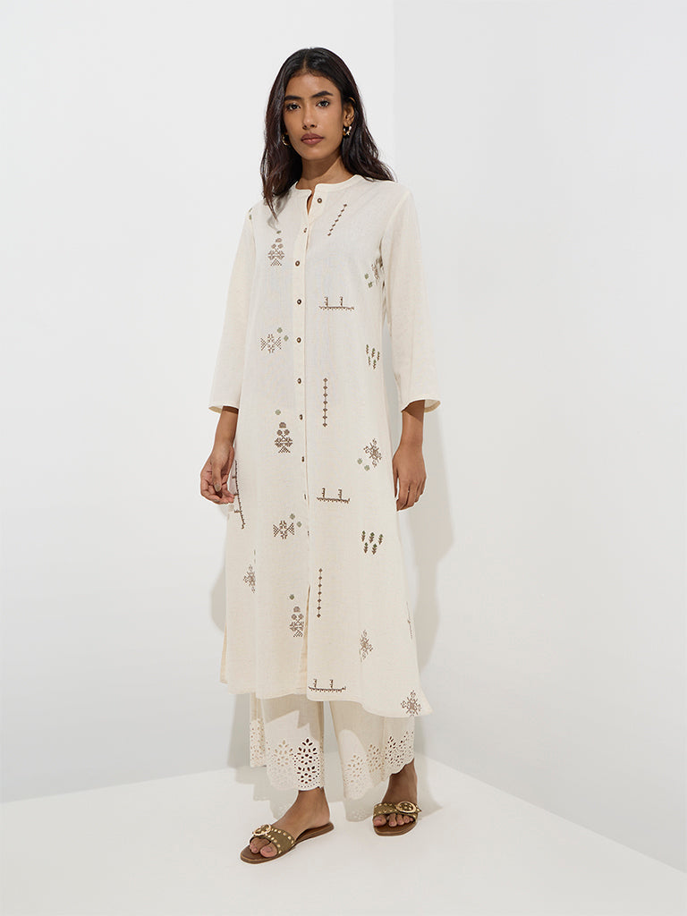 Utsa Off-White Embroidered Cotton-Blend A-Line Kurta