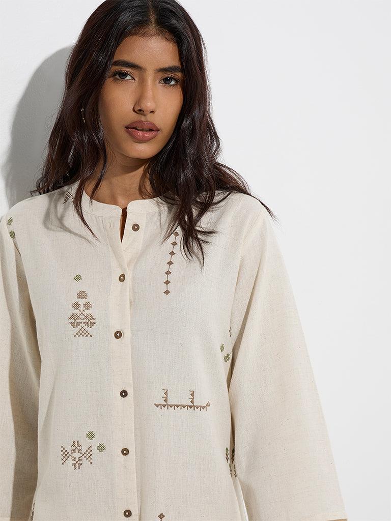 This off-white kurta from Utsa is detailed with cross-stitch embroidery that adds a handcrafted touch to its clean silhouette. Made from a sumptuous cotton-blend fabric and tailored in an A-line shape. it features a band collar and three-quarter sleeves. A slip pocket renders practical utility.