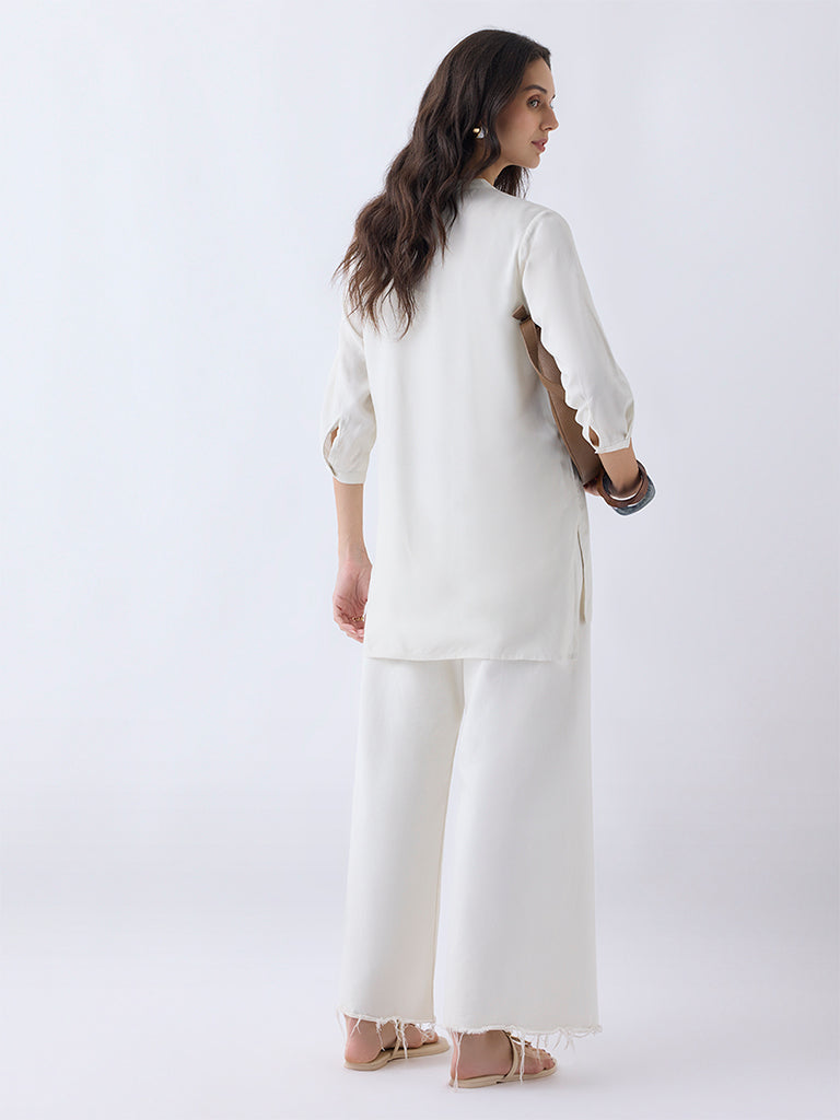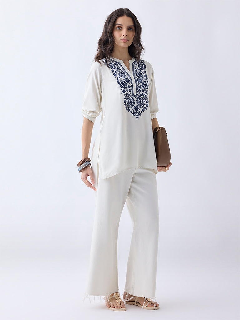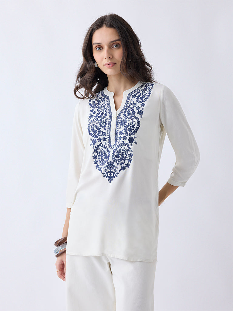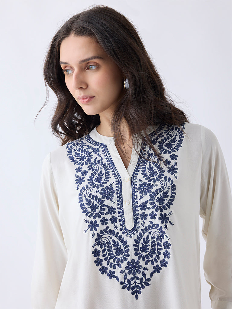 Utsa presents this off-white kurti. designed with a notched neck. short button placket and three-quarter sleeves. it is adorned with vibrant paisley embroidery on an high-low silhouette. Crafted from a high-quality fabric. this versatile piece transitions seamlessly between everyday wear and ethnic occasions.