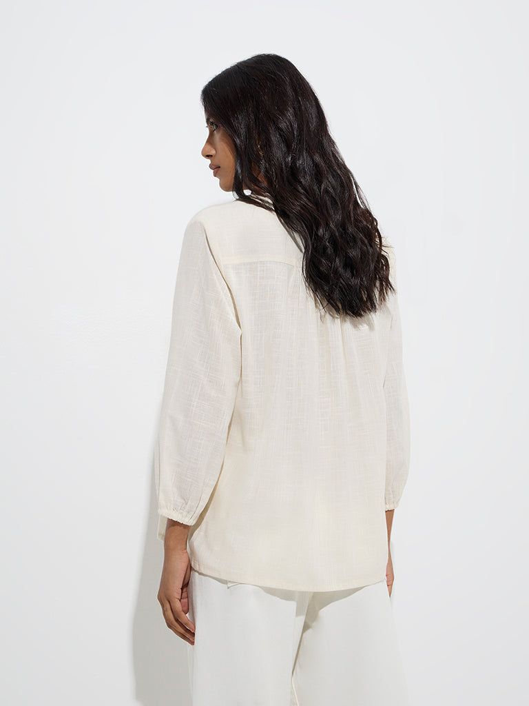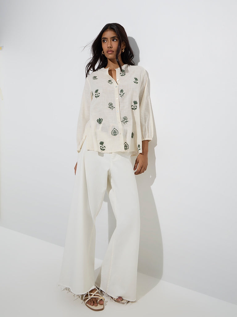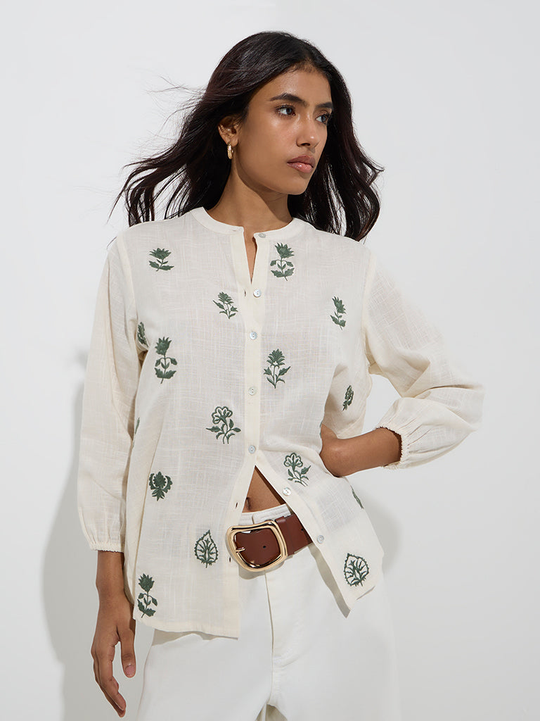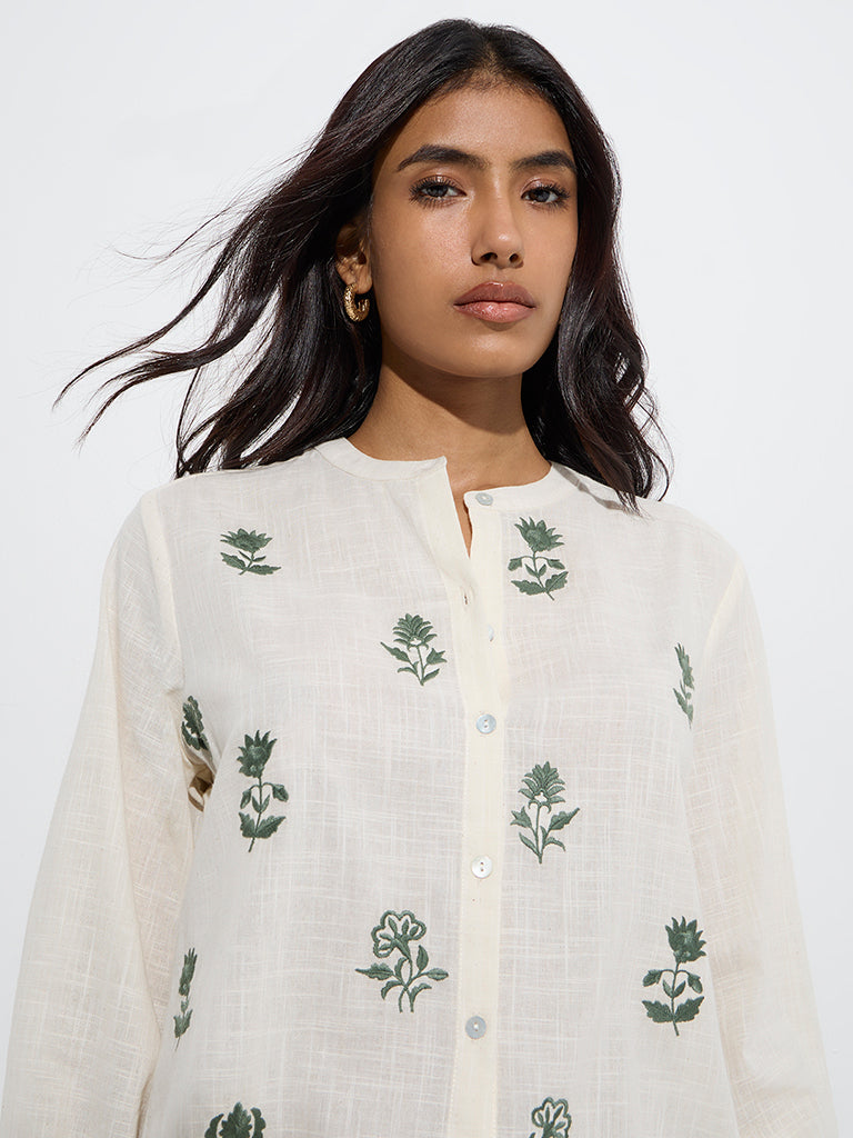 This off-white tunic from Utsa is beautifully accented with floral embroidery. adding a touch of elegance to its understated design. Woven from a breathable fabric for all-day ease. it features a band collar that flows into a button placket for a refined finish.
