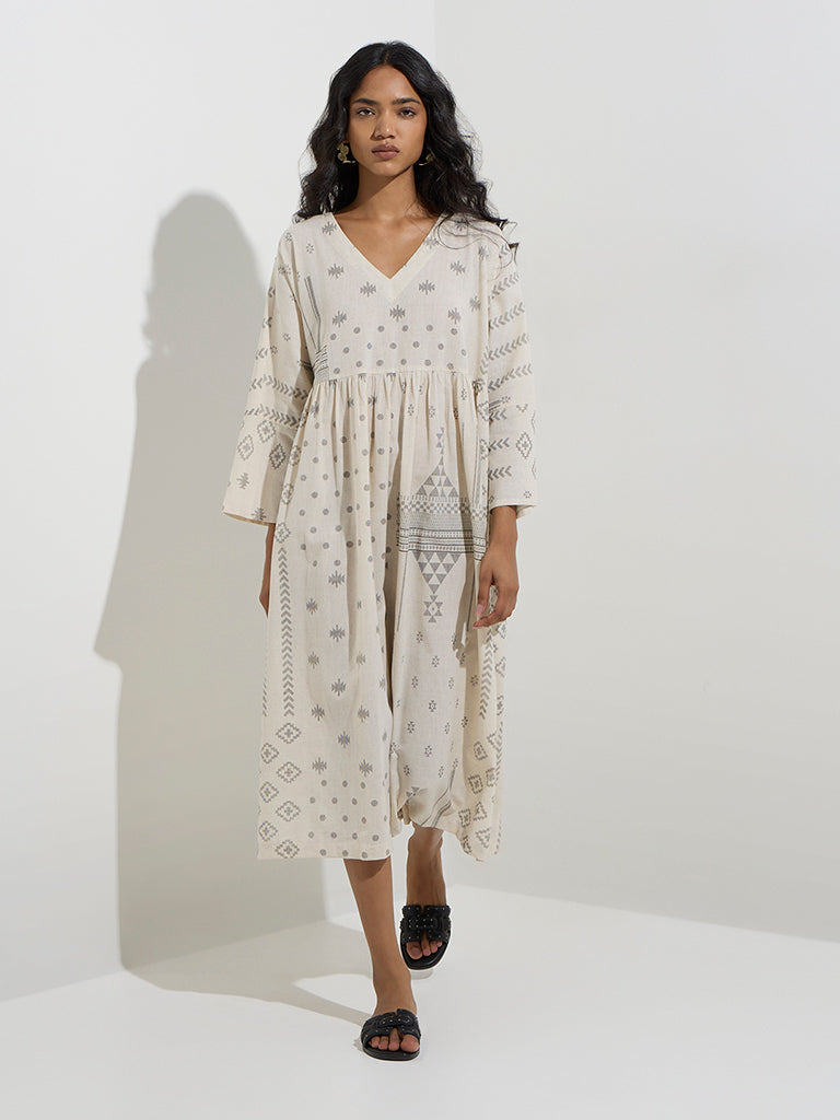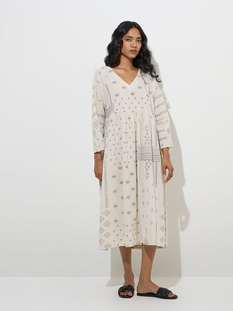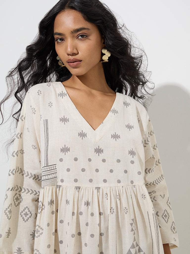 Utsa Off-White Geometric Pattern Cotton-Blend A-Line Dress