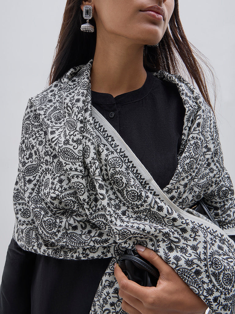 This off-white stole by Utsa highlights intricate paisley embroidery throughout. It is created from pure wool and ensures a regal touch to your ethnic outfits.