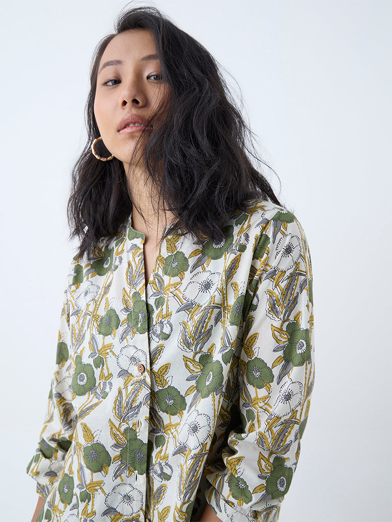 Infused with understated charm. this olive tunic from Utsa is constructed from pure cotton for breathable comfort through the day. The mandarin neckline flows into a buttoned placket. while full sleeves lend a polished finish. Graceful botanical motifs add a nature-inspired finish.