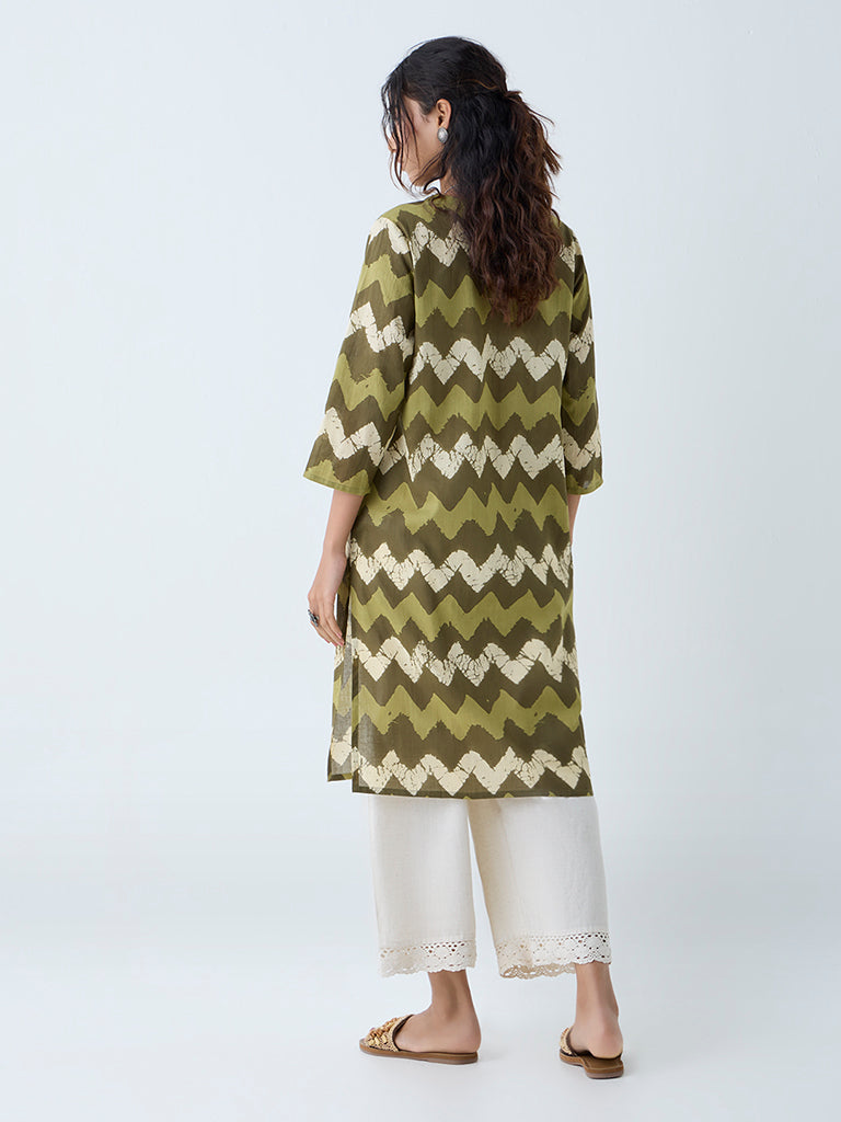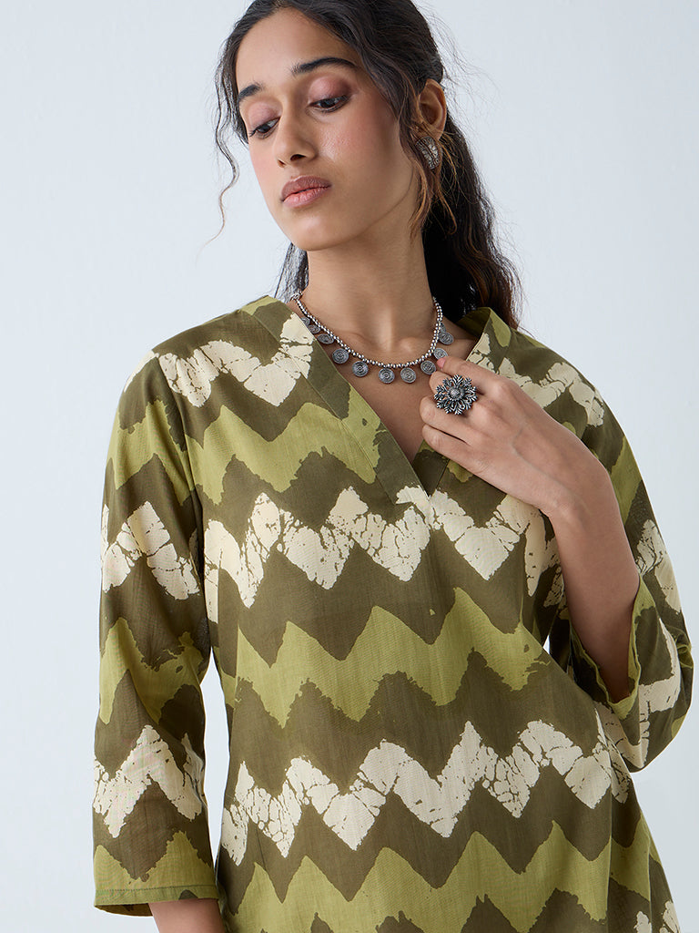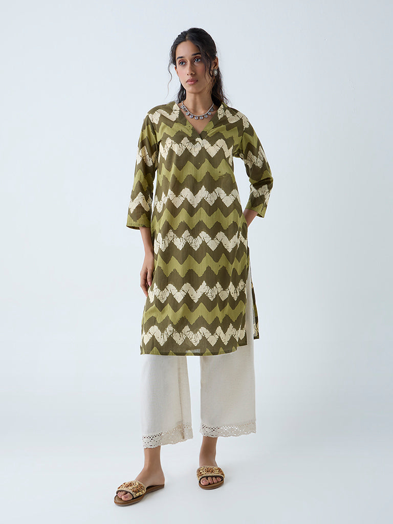 Utsa Olive Chevron Pattern Straight Cotton Kurta