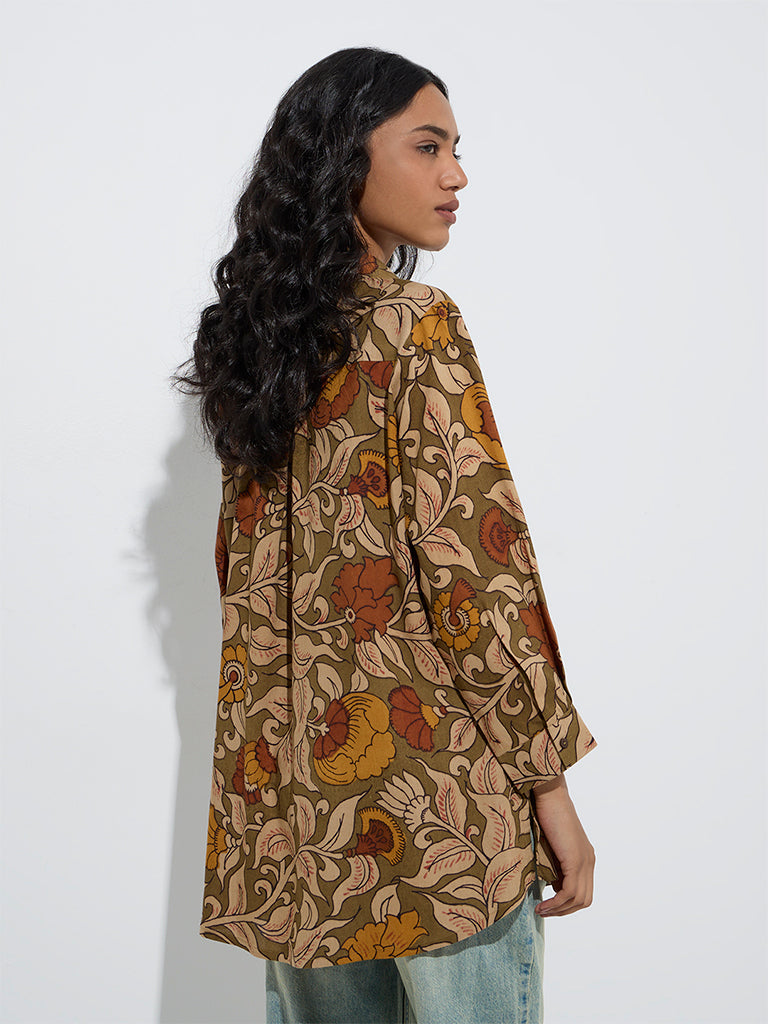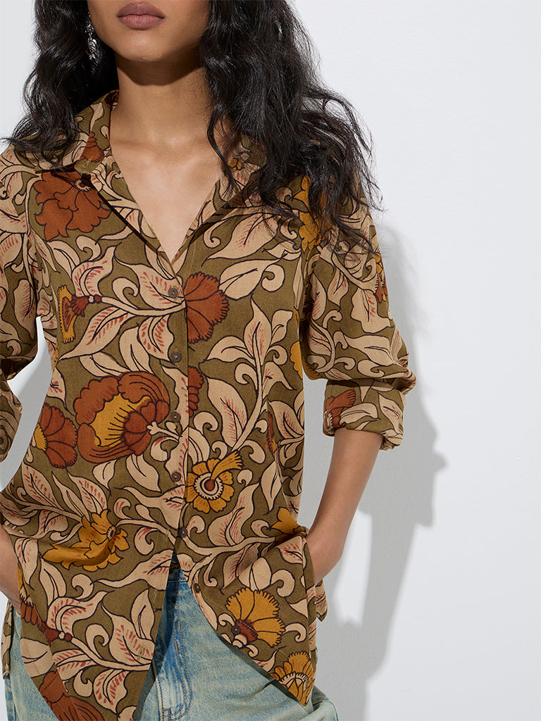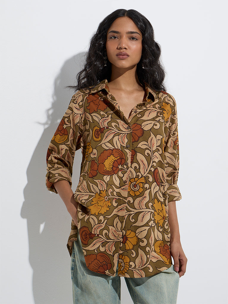 This olive ethnic tunic from Utsa highlights graceful botanical prints. Woven from an ultra-lightweight fabric. it is designed with full sleeves. a semi-spread collar. and a button placket for a refined look.