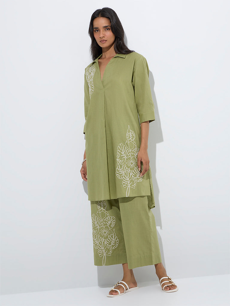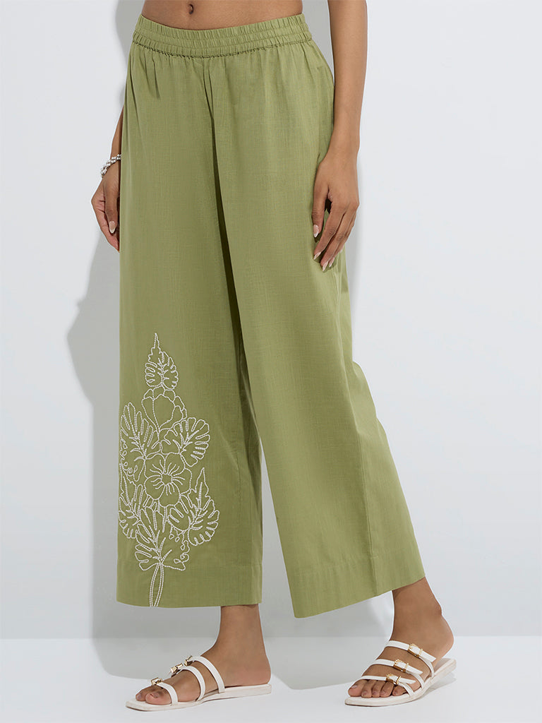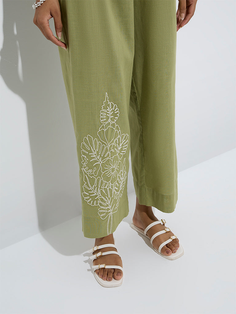 Utsa Olive Floral Embroidered Cotton Ethnic Pants