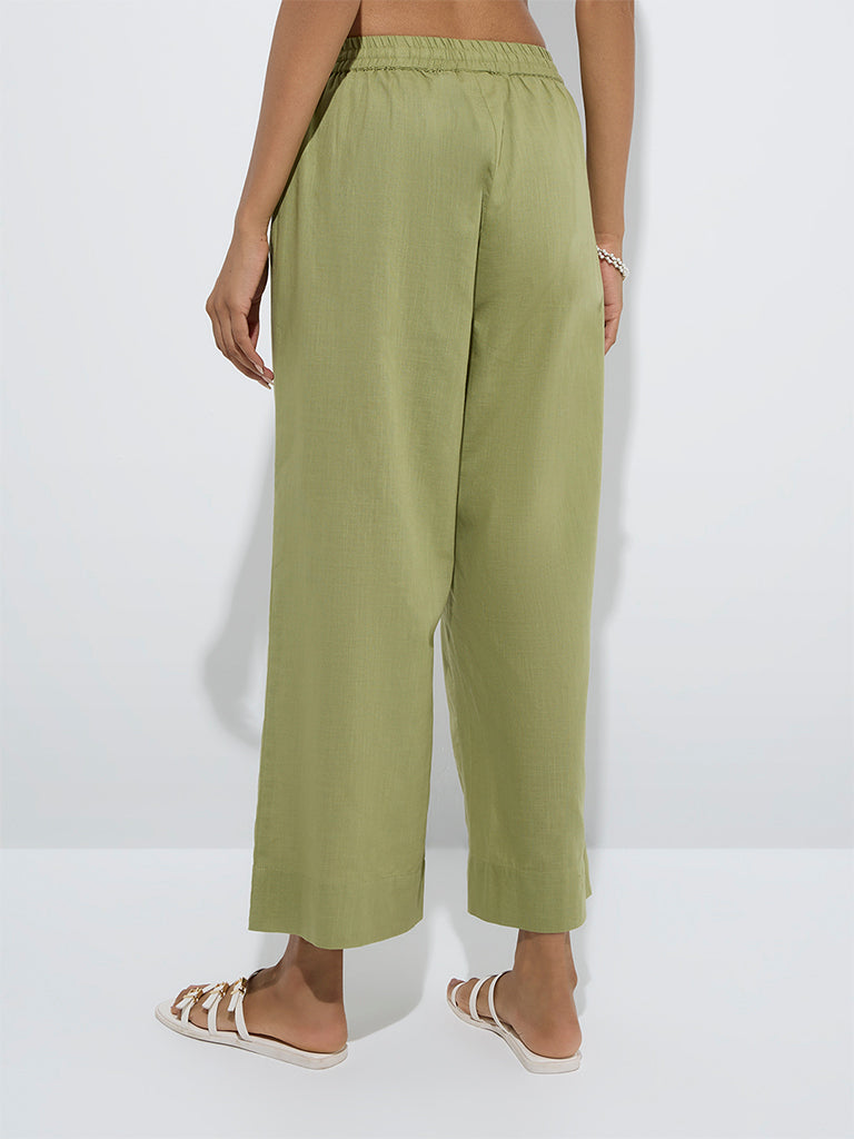 These olive ethnic pants from Utsa are woven from pure cotton for all-day comfort and showcase floral embroidery. Designed with an elasticated waistband with attached drawstrings. they bring ease and colour to your everyday ethnic wardrobe