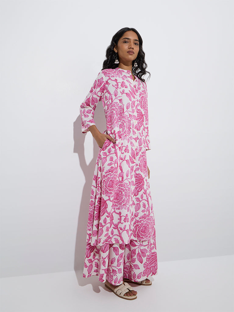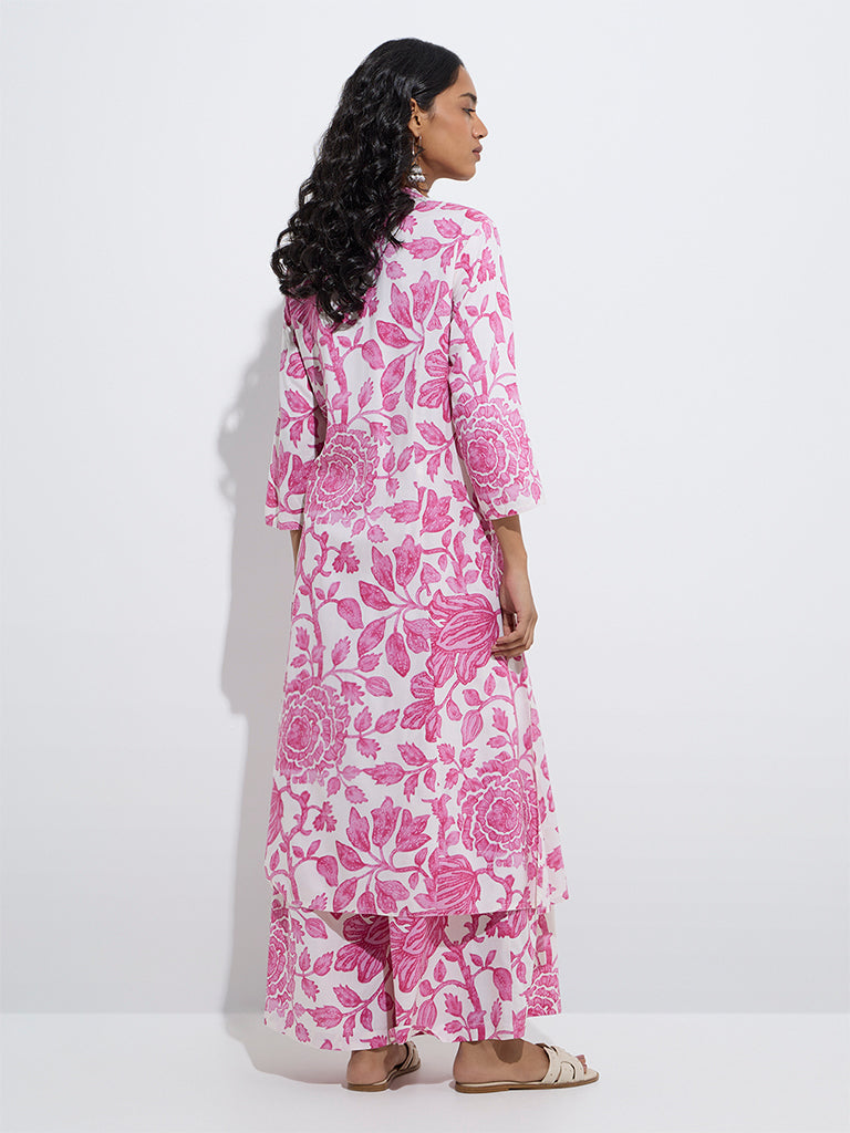 This pink kurta from Utsa spotlights botanical motifs for a refreshing appeal. Made from a breathable fabric in an A-line silhouette. it is styled with a band-neck collar. a button placket. three-quarter sleeves. and handy slip pockets for added practicality.