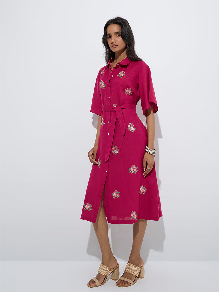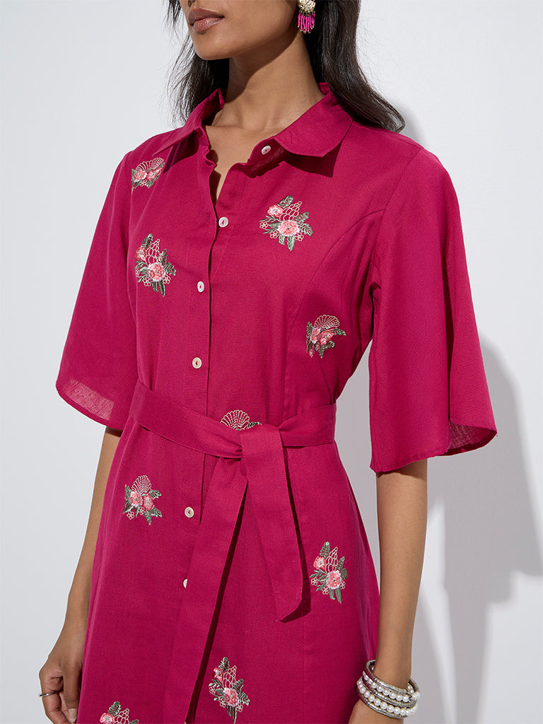 Embrace graceful charm with this pink dress from Utsa. Crafted from a rich cotton-linen blend. it features elegant floral embroidery and an A-line silhouette for a flattering fit. Designed with a spread collar. button-down front. and bell sleeves. the look is completed with a knot detail at the back created by attached ribbons for an added touch of femininity.