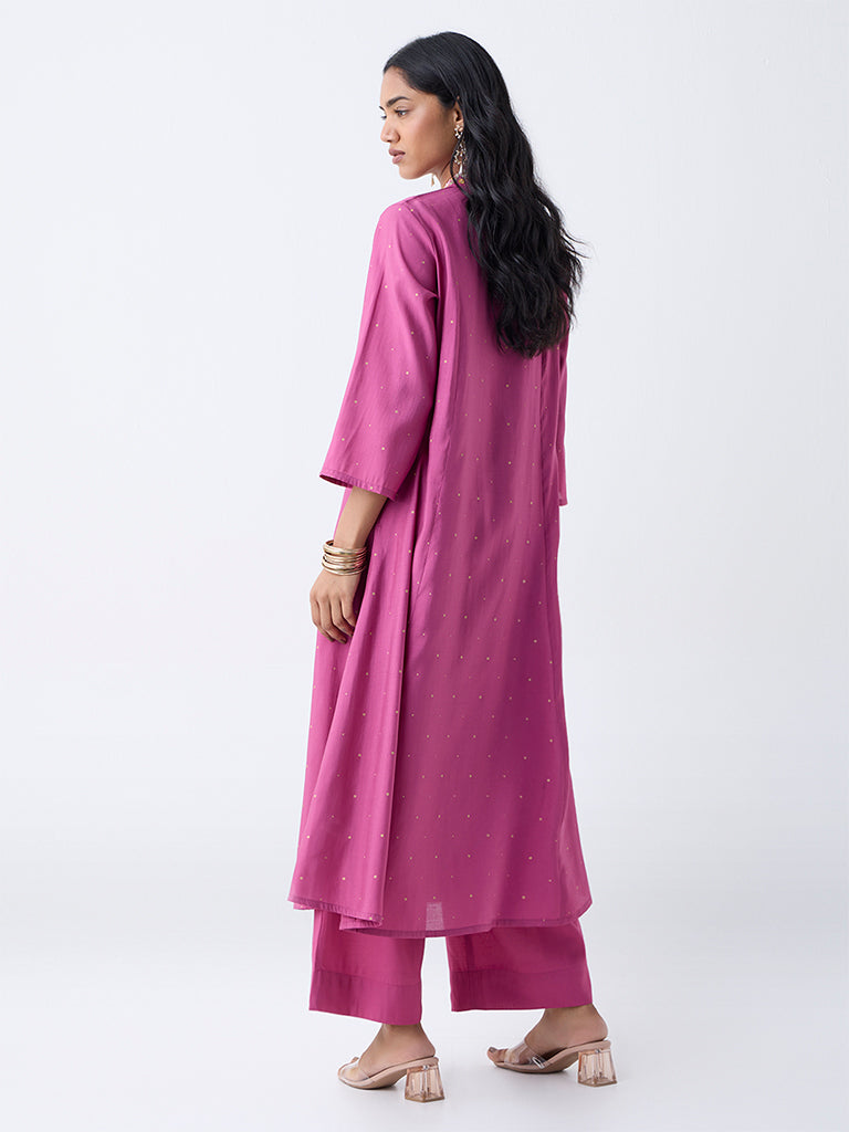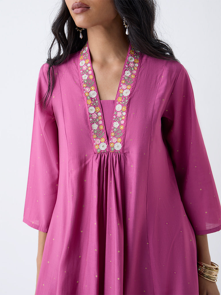 Bring a feminine touch to your ethnic assortment with this pink kurta from Utsa. Detailed with exquisite floral embroidery along the V-neck. it is shaped in a flattering A-line silhouette and finished with three-quarter sleeves. Side pockets add a layer of functionality. making it as practical as it is graceful.