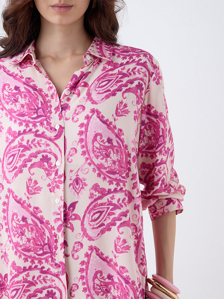 Utsa presents this pink tunic adorned with lively paisley motifs. capturing a perfect blend of tradition and contemporary style. Crafted from an ultra-lightweight fabric. it features a classic collar that extends to a button placket and full sleeves for a refined silhouette.