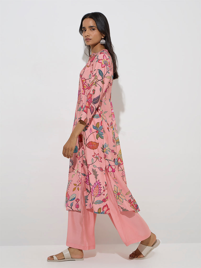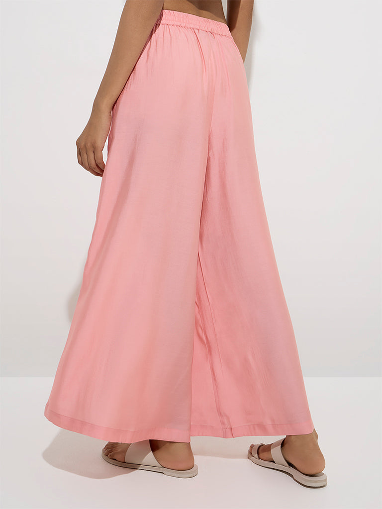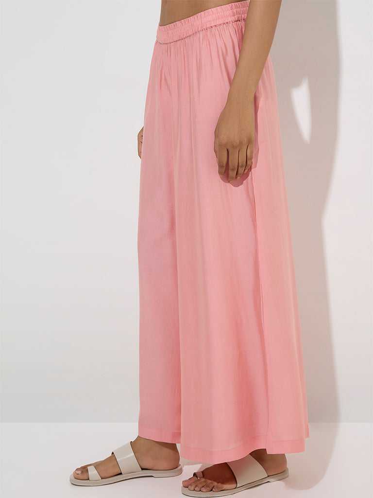 These pink palazzos from Utsa showcase a solid hue for versatile styling. Created for all-day comfort. they come with an elasticated waistband and adjustable drawstrings. offering a secure fit with an easy-going feel.
