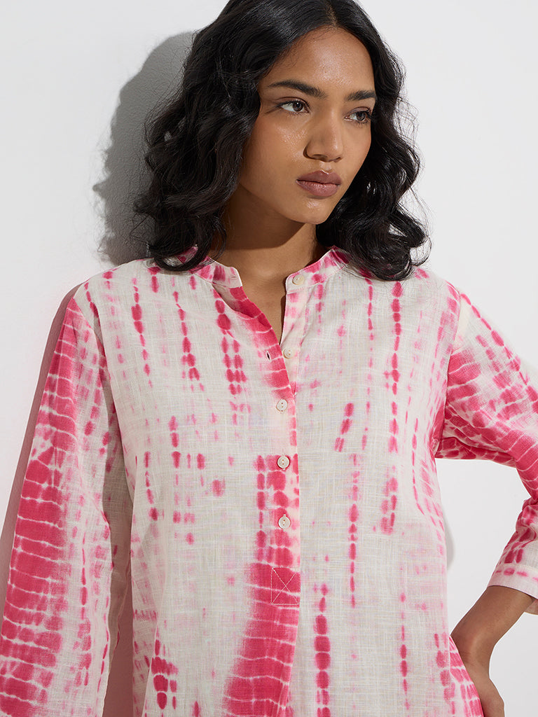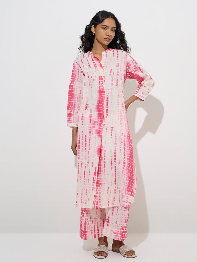 This pink kurta from Utsa brings a fresh take on everyday dressing. showcasing a bold tie-dye pattern. Milled from pure cotton. it is tailored in an A-line silhouette and features a band neck that extends to a button placket. along with three-quarters sleeves for added elegance.