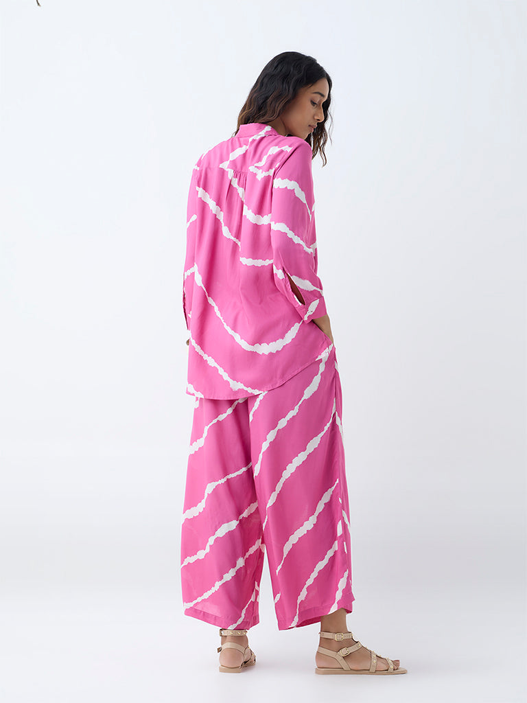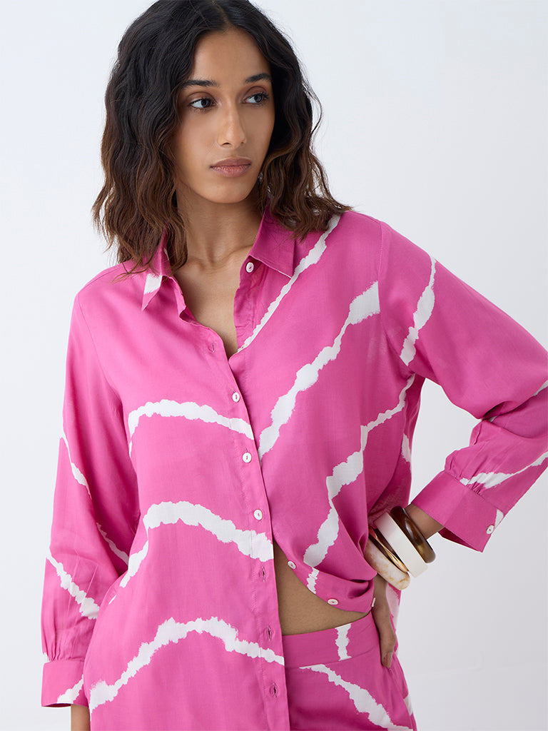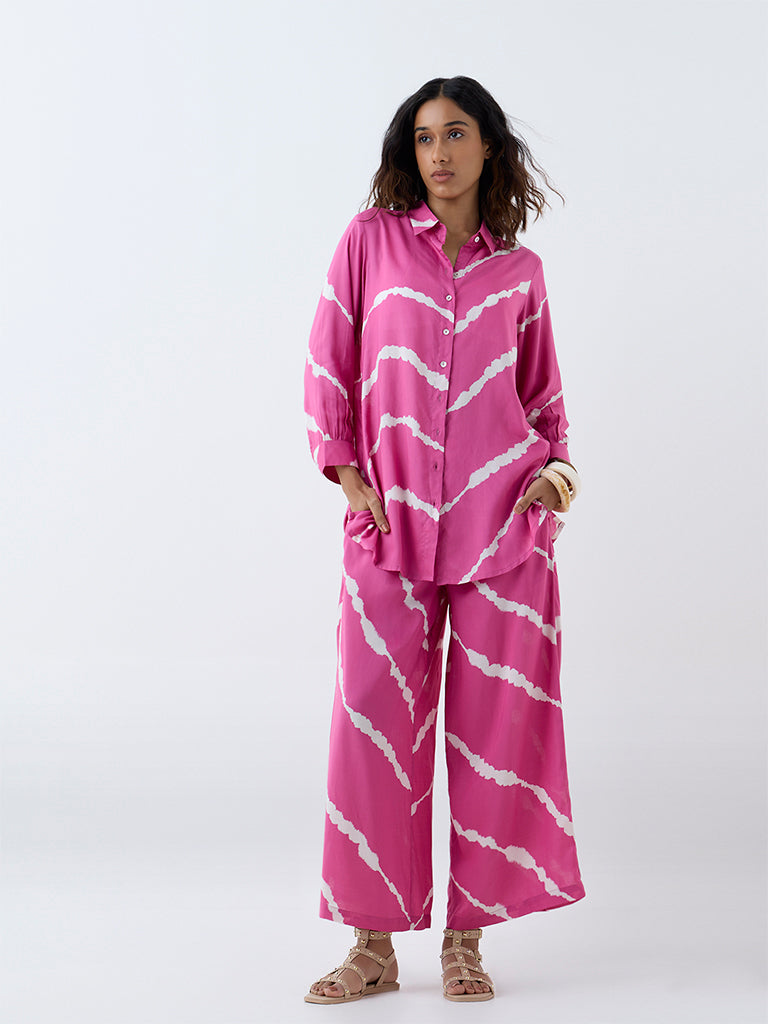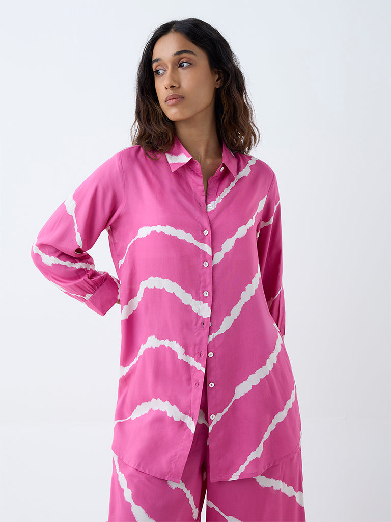 This pink tunic from Utsa brings a contemporary spin to everyday style with its tie-dye pattern. Spun from a breathable fabric. it’s detailed with a spread collar that extends to a button placket and full sleeves with buttoned cuffs.
