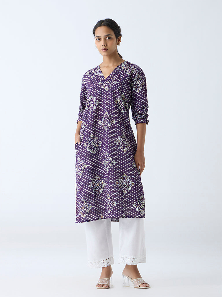 This purple kurta from Utsa is enlivened with timeless bandhani prints for a touch of heritage charm. Spun from pure cotton. it features a V-neck and three-quarter sleeves. while a slip pocket lends added functionality.