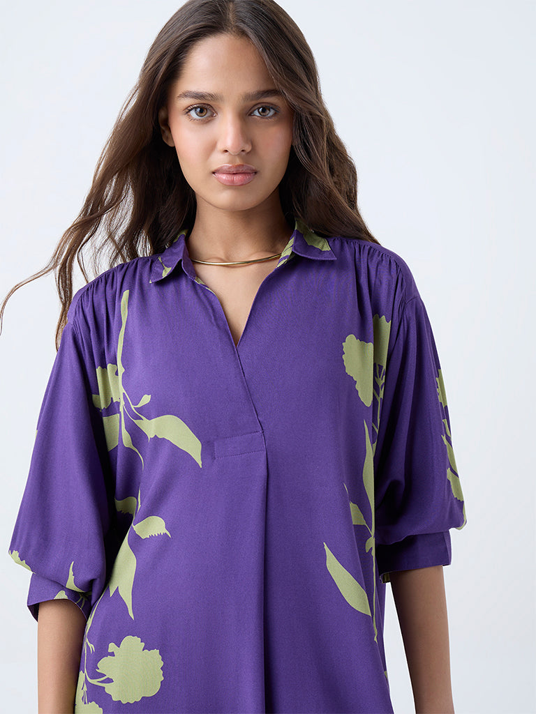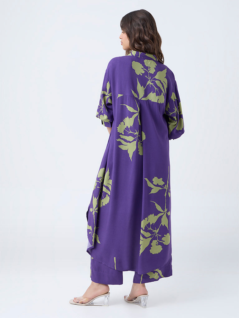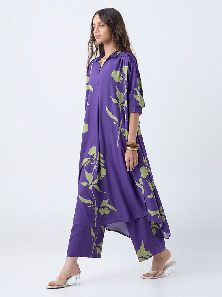 Step into contemporary elegance with this purple kurta from Utsa. Showcasing a refined floral print. the design features a smart collar. full sleeves. and a flattering high-low hemline that adds gentle movement. Functional side pockets complete the piece. keeping it equal parts modern and comfortable for everyday wear.