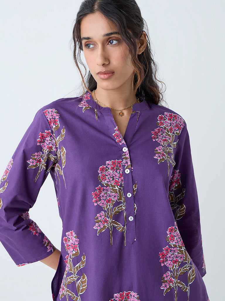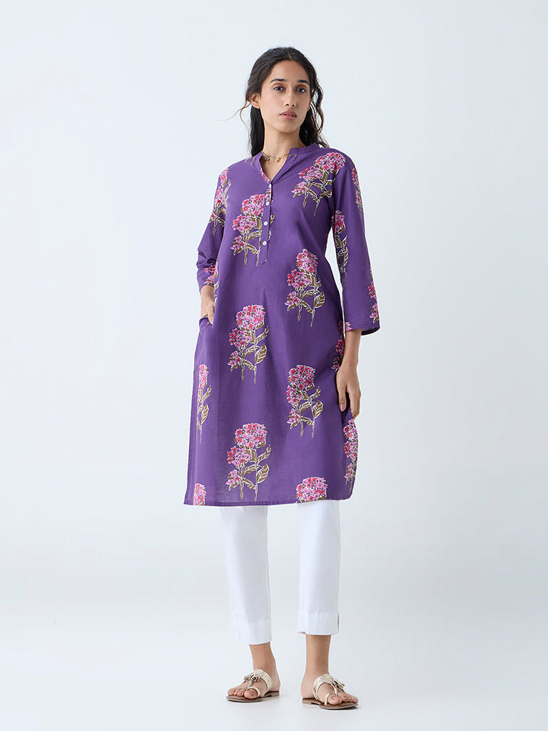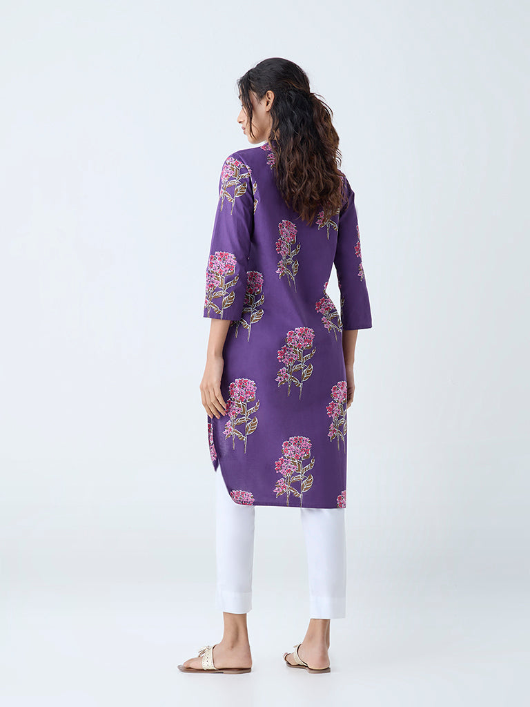 Utsa Purple Floral Detailed Cotton Straight Kurta