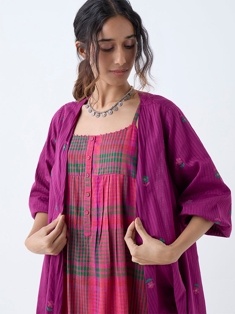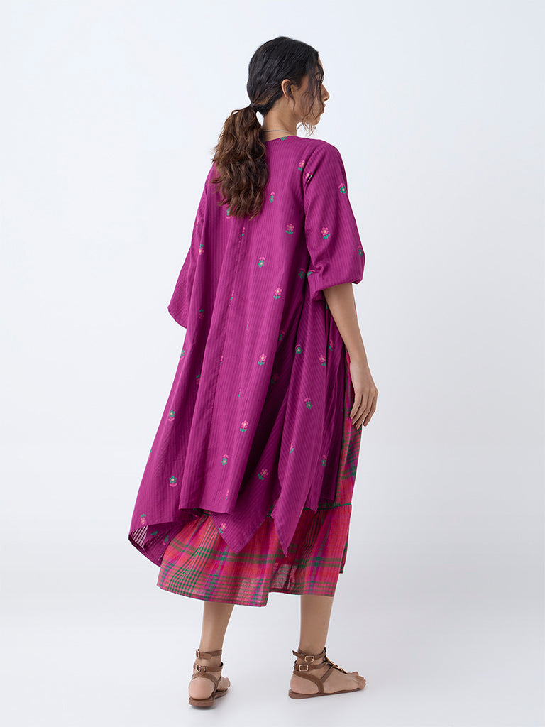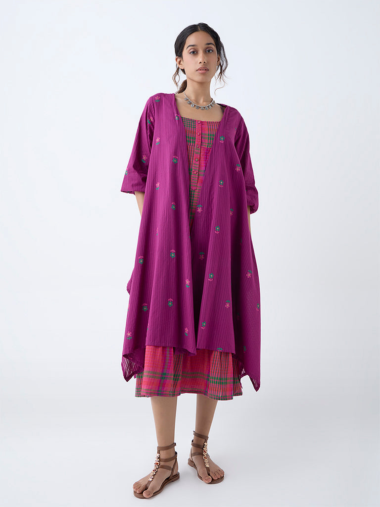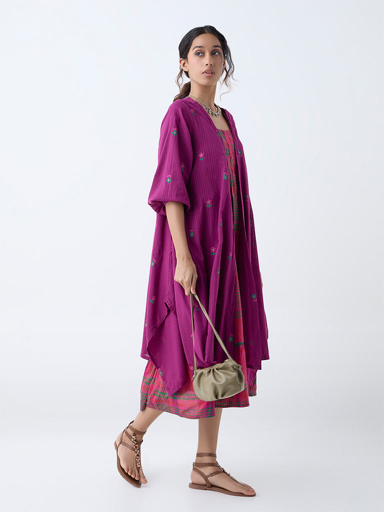 Layer with ease and elegance in this purple shrug from Utsa. Styled with dainty floral embroidery for a feminine touch. it’s crafted from breathable fabric for all-day comfort. Functional side pockets add everyday convenience. making it the perfect throw-on piece to elevate both casual and festive looks.
