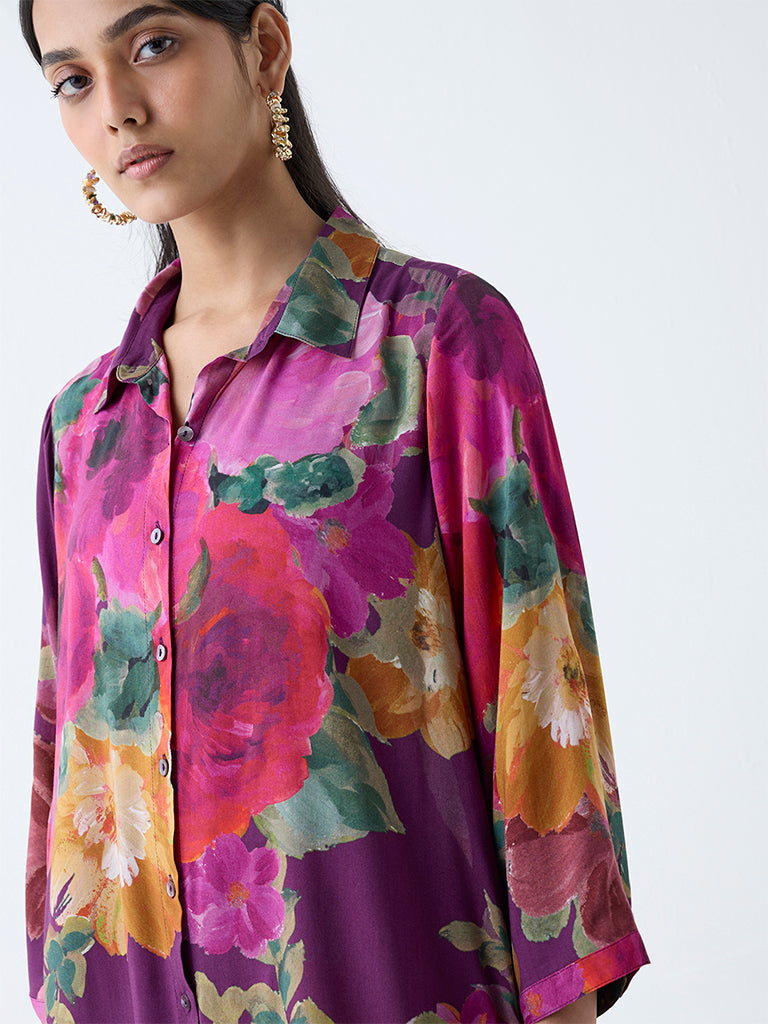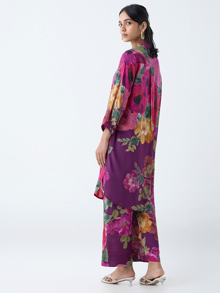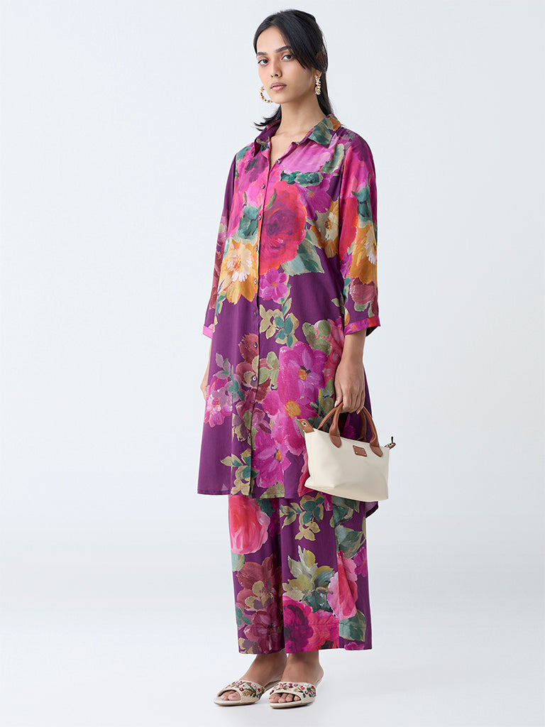 Embrace contemporary styling with this purple kurta from Utsa. Woven from premium fabric for a comfortable feel. it features a collar extending to a button placket. three-quarter sleeves. and practical side pockets. Adorned with vivid floral patterns. this piece blends modern design sensibilities with traditional charm.