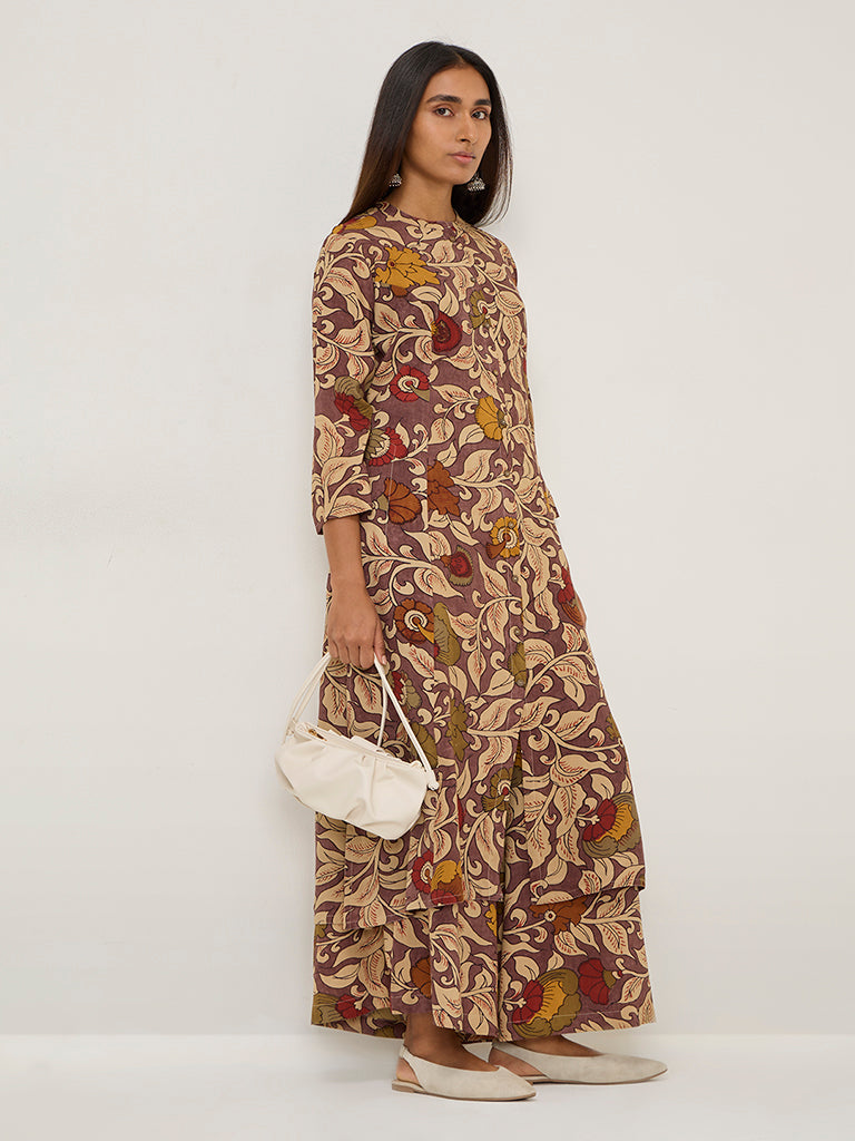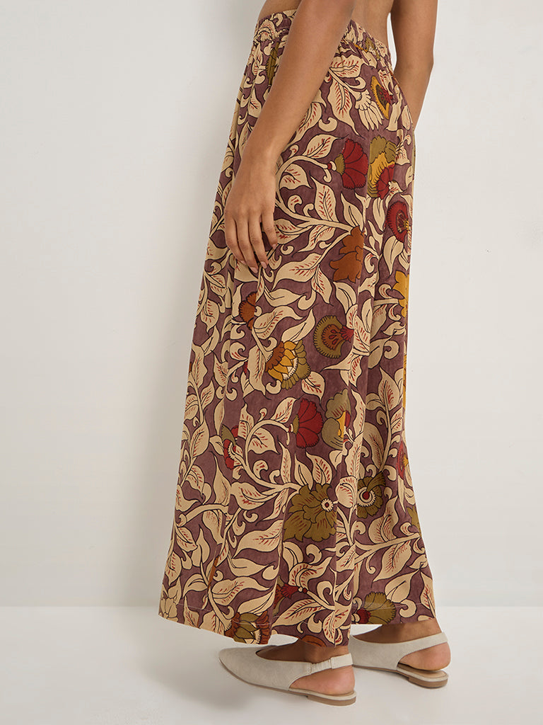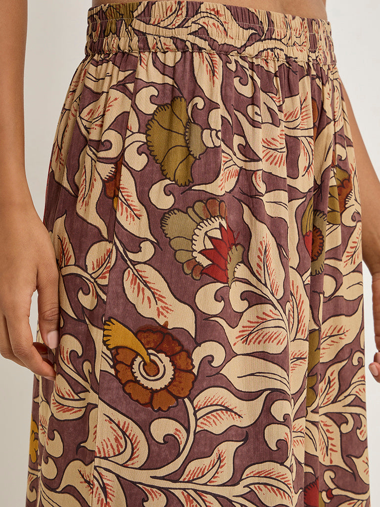 These purple palazzos from Utsa are adorned with floral patterns. Designed with a high-rise fit. the breathable separate is fitted with an elasticated waistband for a snug fit.
