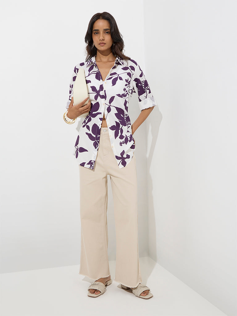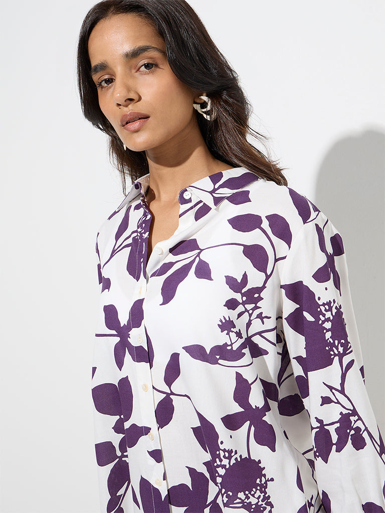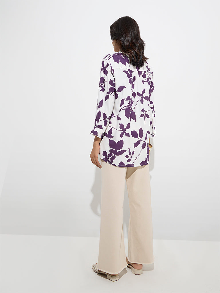 This purple ethnic tunic from Utsa adds a rich. earthy tone to your wardrobe with its nature-inspired leaf motifs. Created from a super-soft fabric for long-lasting comfort. it’s designed with a crisp collar that extends to a button placket and full sleeves.