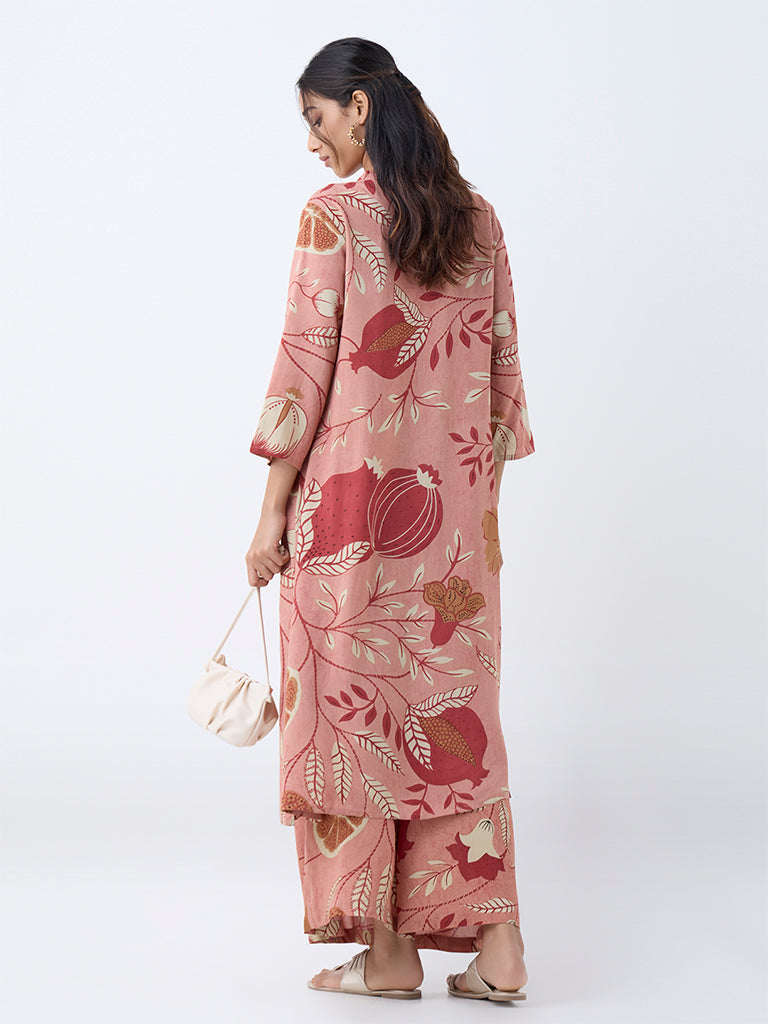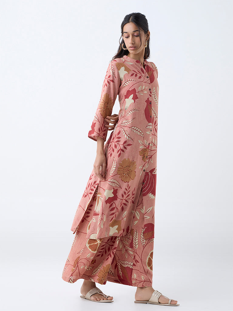 Bring effortless grace to your ethnic contingent with this red kurta from Utsa. patterned with botanical motifs that whisper of timeless craft. Shaped in a flowing A-line silhouette. it frames the figure with ease while the band collar and button placket lend a touch of structure. Three-quarter sleeves balance the design with modest charm. and a discreet slip pocket adds functionality without compromising style.