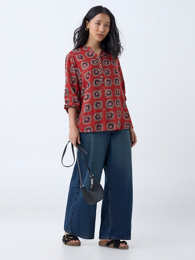 Refresh your daily lineup with this red tunic from Utsa. detailed with graceful botanical prints that add quiet charm. Cut from an ultra-lightweight fabric. it’s tailored with a mandarin neckline. a short button placket. and full sleeves.