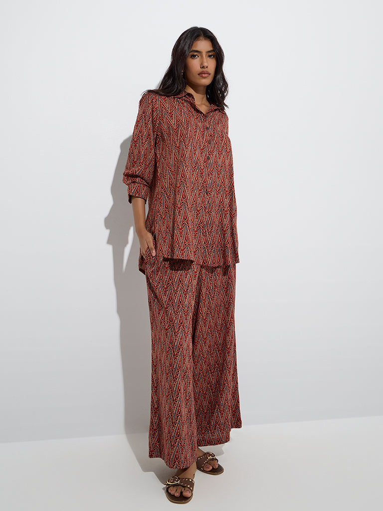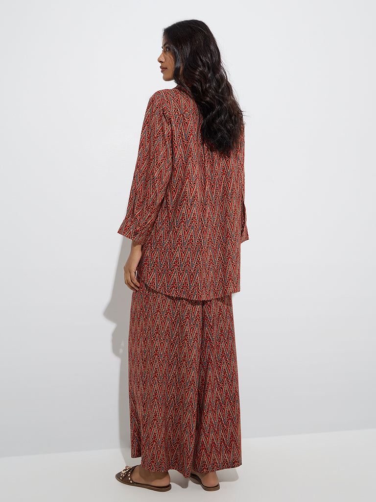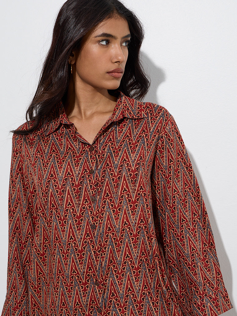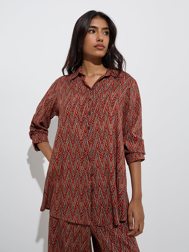 This red ethnic tunic from Utsa is highlighted with an eye-catching chevron pattern that blends tradition with a modern twist. Spun from a lightweight fabric for all-day ease. it features a structured collar that extends into a neat button placket. while full sleeves add a touch of sophistication.