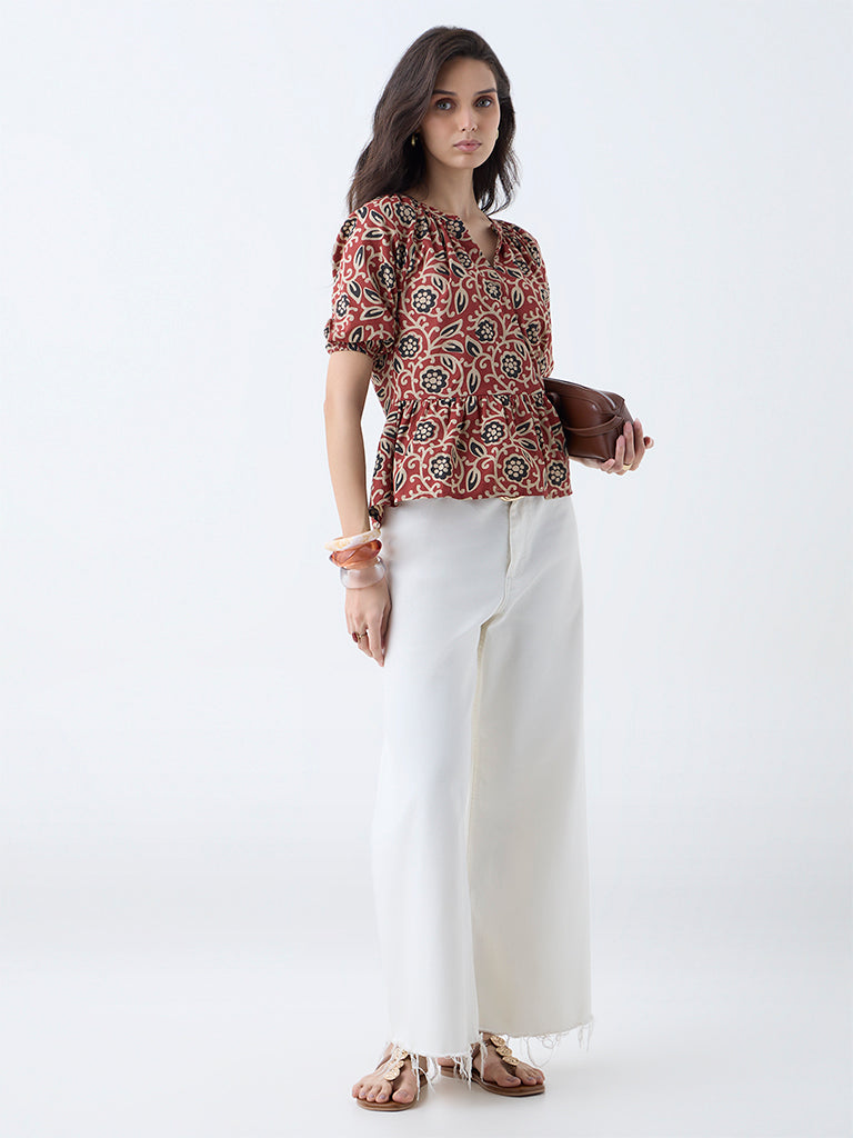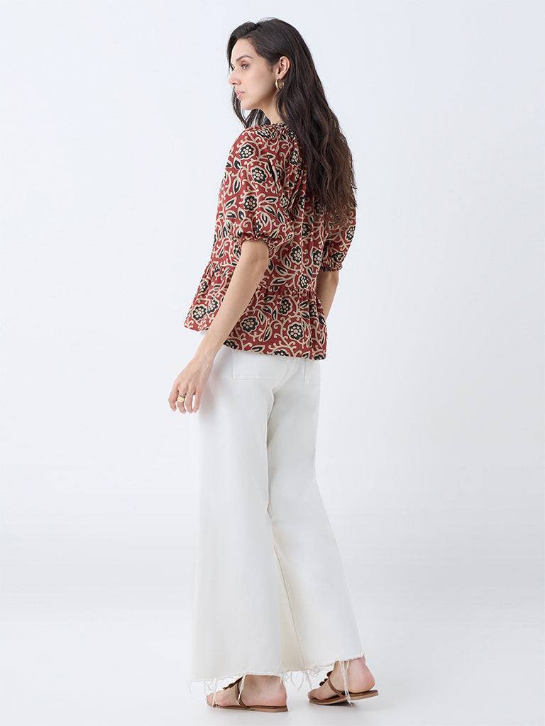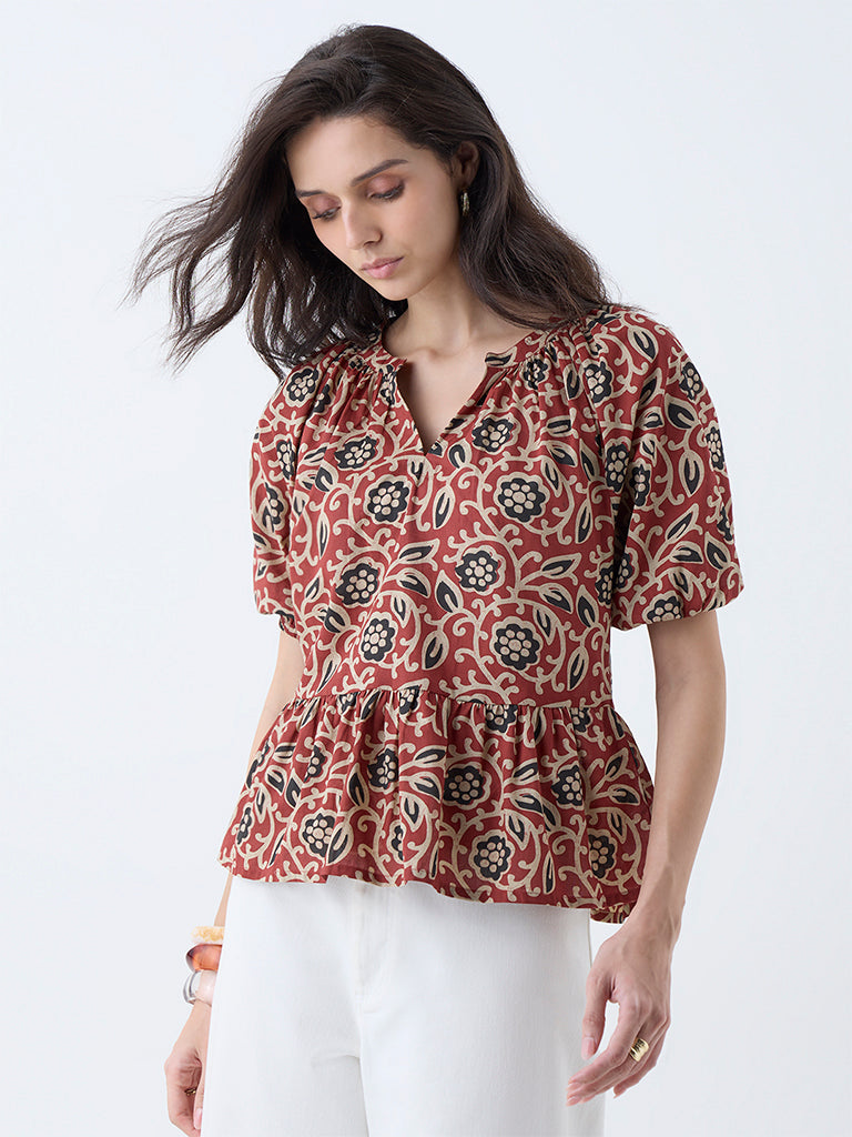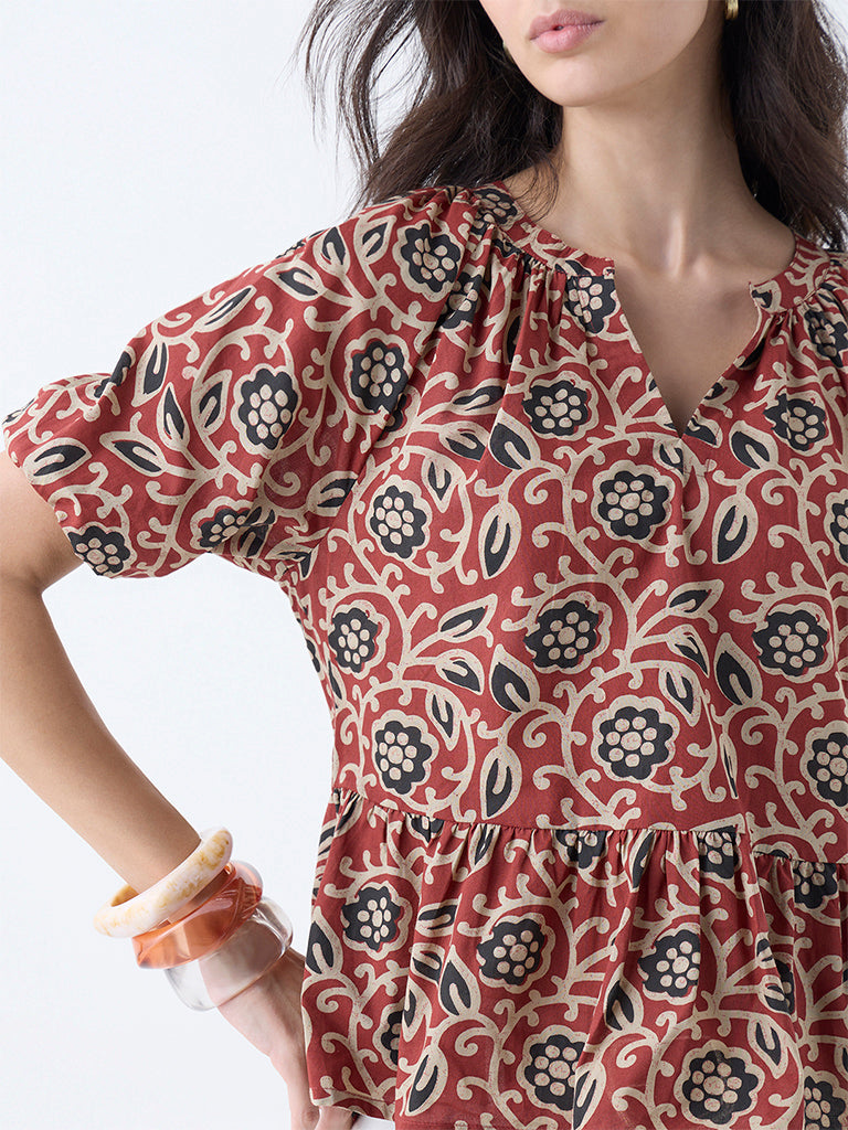 Utsa Red Floral Design Cotton Peplum Top