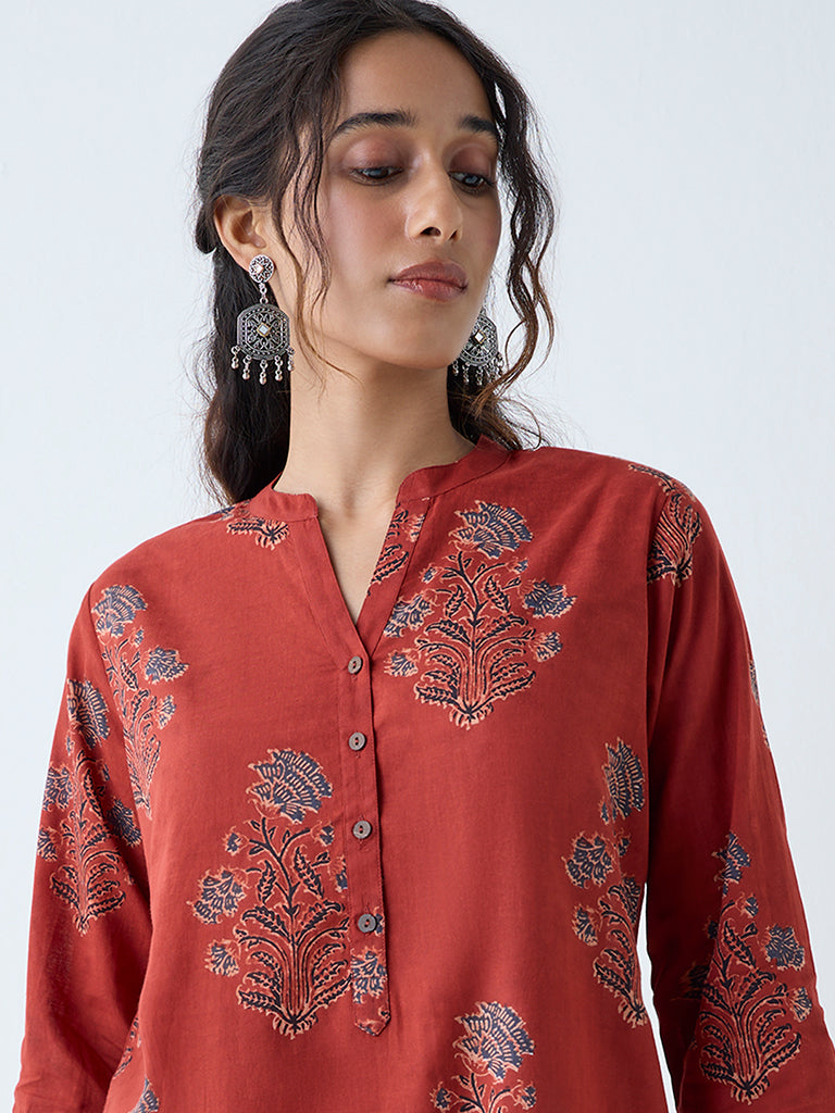 This red kurta from Utsa is decorated with intricate floral motifs that exude quiet elegance. Made from a cotton-rich fabric for breathable comfort. it’s styled with a notched neck. a short button placket. and three-quarter sleeves. The slip pocket renders practicality.