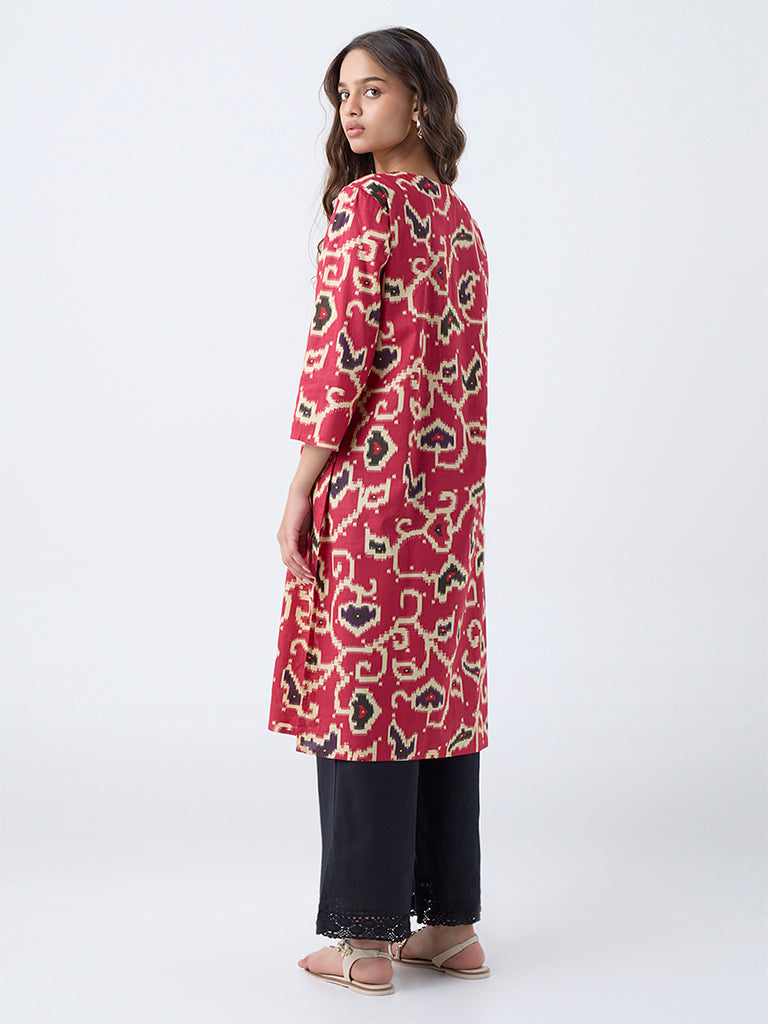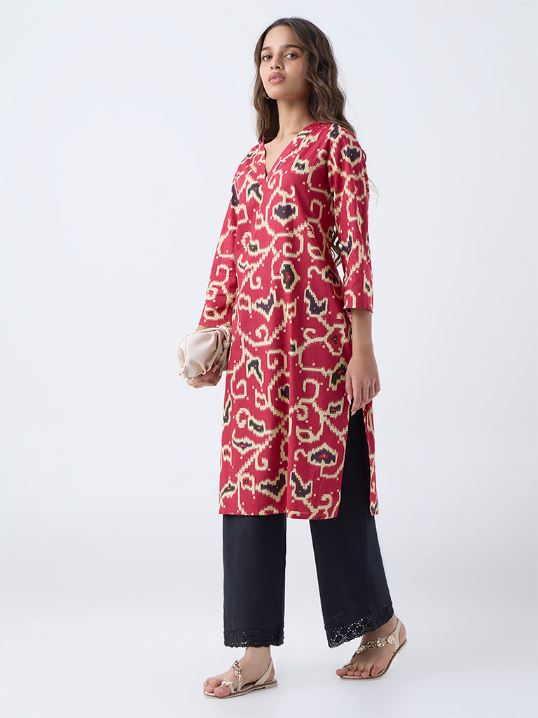 Brighten your everyday style with this red floral straight cotton kurta from Utsa. Featuring a V-neck. three-quarter sleeves. and a handy side pocket. it combines comfort and effortless charm for casual outings or relaxed occasions.