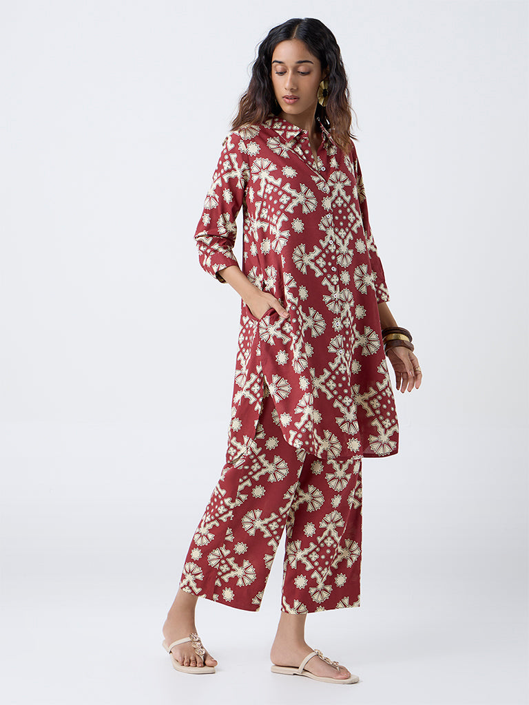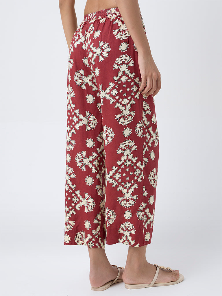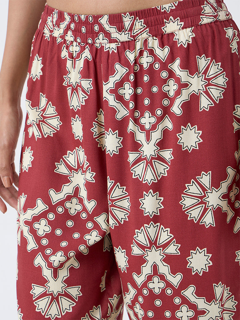 Utsa introduces these red ethnic pants defined by striking geometric prints. Woven from breathable fabric. the pair is designed with an elasticated waist and adjustable drawstrings for a customised fit. A comfortable essential that pairs style with ease for everyday wear.