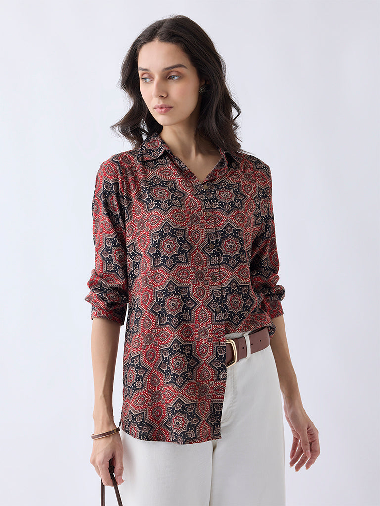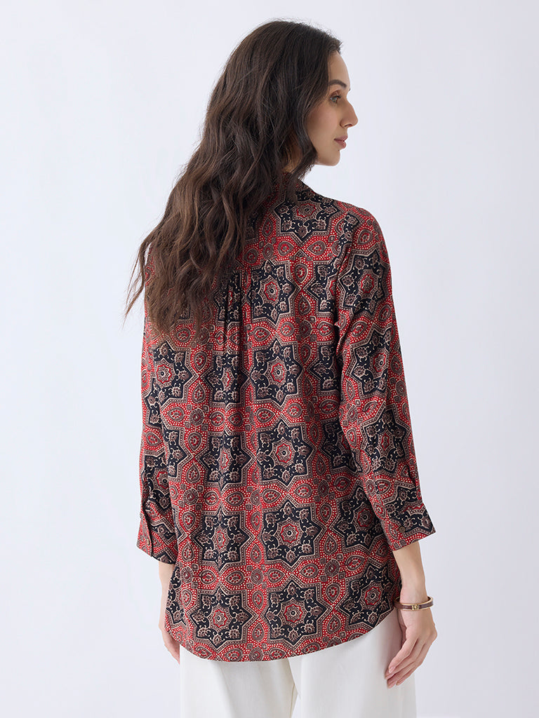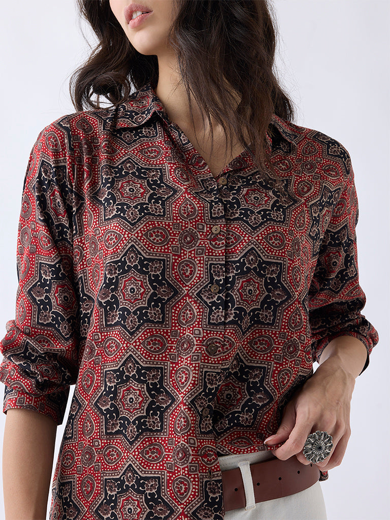 Utsa introduces this red tunic exhibiting striking prints on a premium-blend fabric. It is styled with a spread collar. a brief button placket and three-quarter sleeves. Crafted for all-day comfort. it is perfect for all casual ethnic outings.