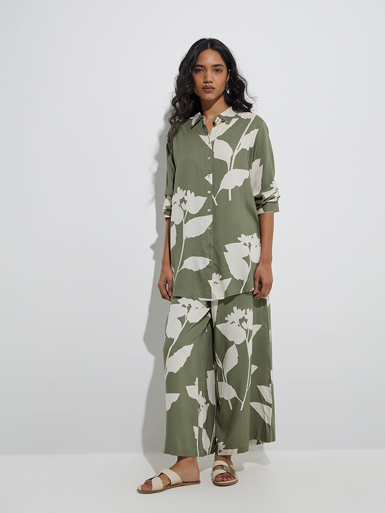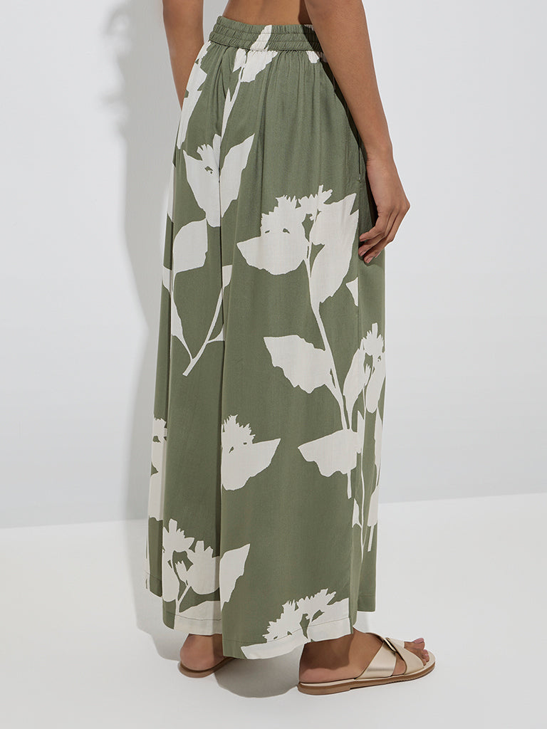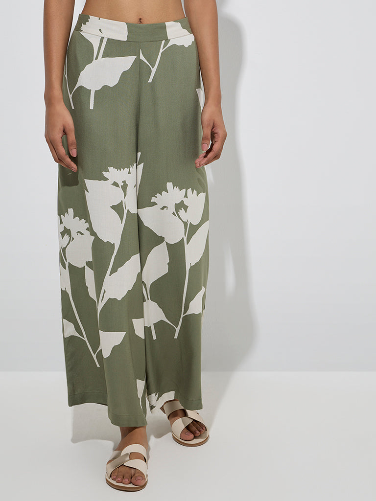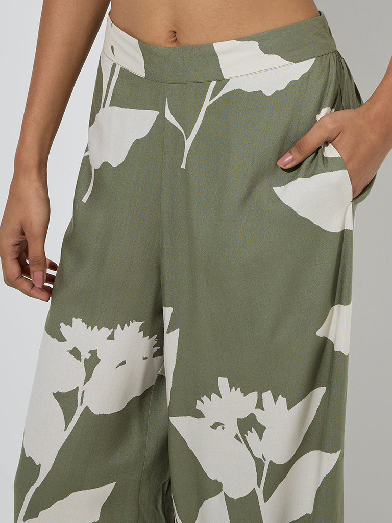 Breezy and nature-inspired. these sage palazzos from Utsa are printed with delicate foliage motifs. Made from a lightweight fabric. they feature an elasticated waistband for a comfortable fit and side pockets for everyday practicality