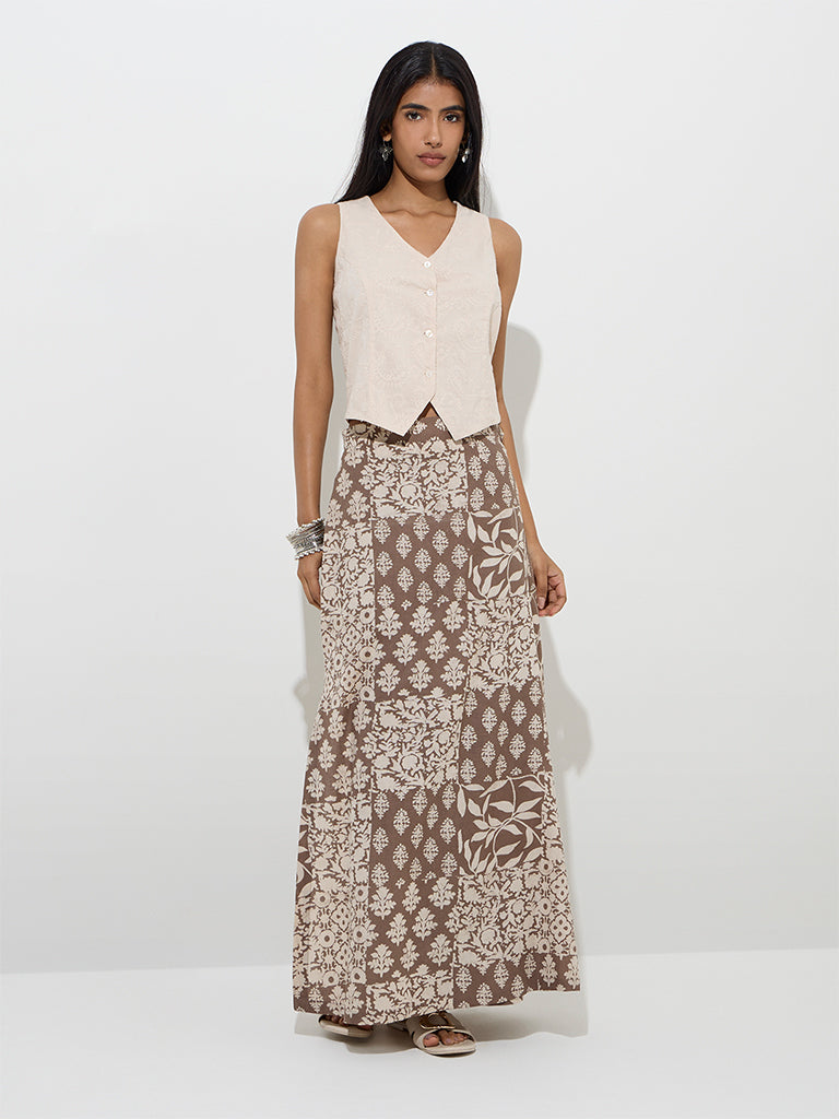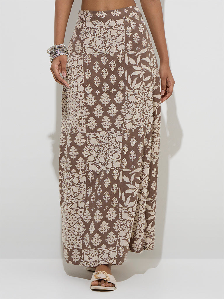 Utsa Taupe Floral Design Wrap-Style Cotton-Blend Skirt