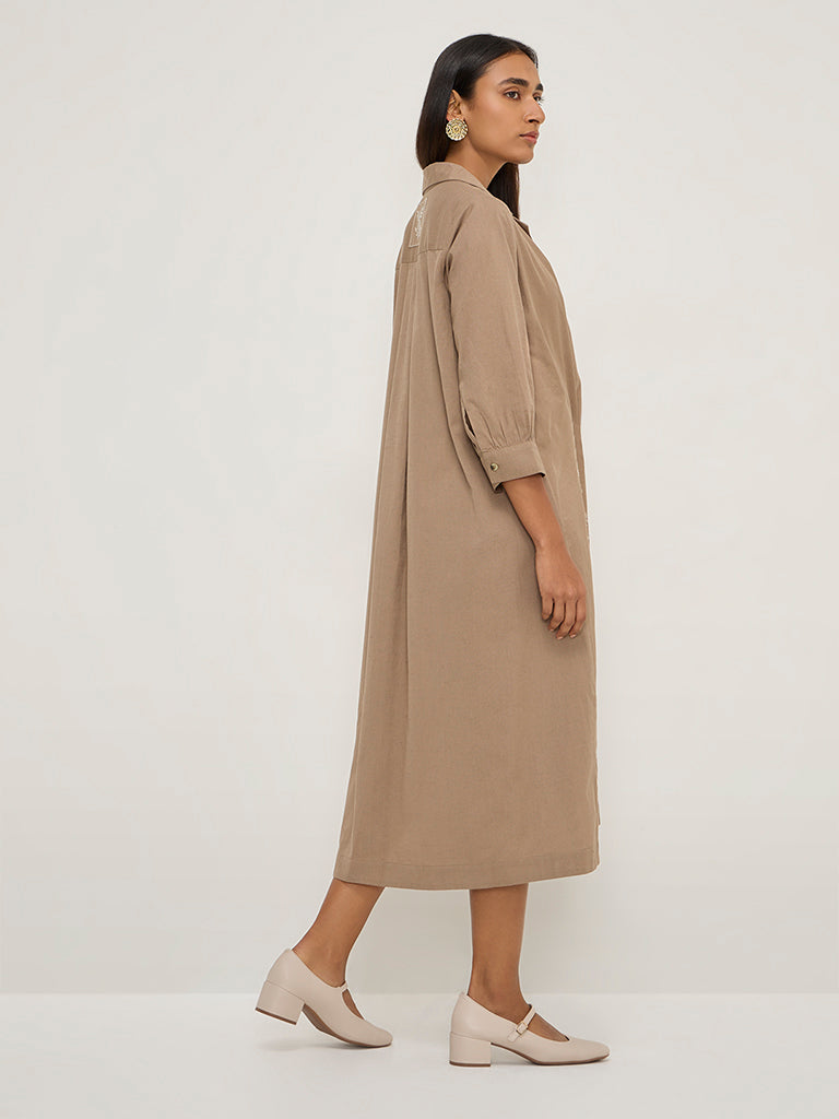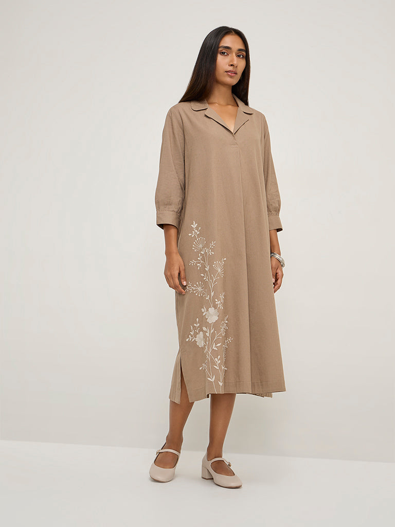 Utsa Taupe Floral Embroidered Cotton Shirt Dress