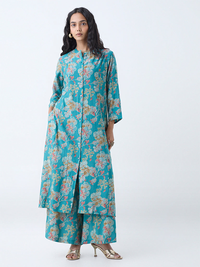 In a refreshing teal hue. this kurta by Utsa is tailored in a flattering A-line silhouette and adorned with graceful floral motifs. The band neck flows into a neat button placket. while three-quarter sleeves and a discreet slip pocket balance style with everyday ease.
