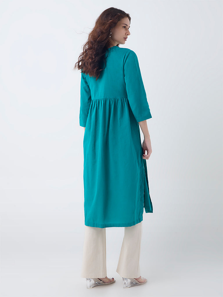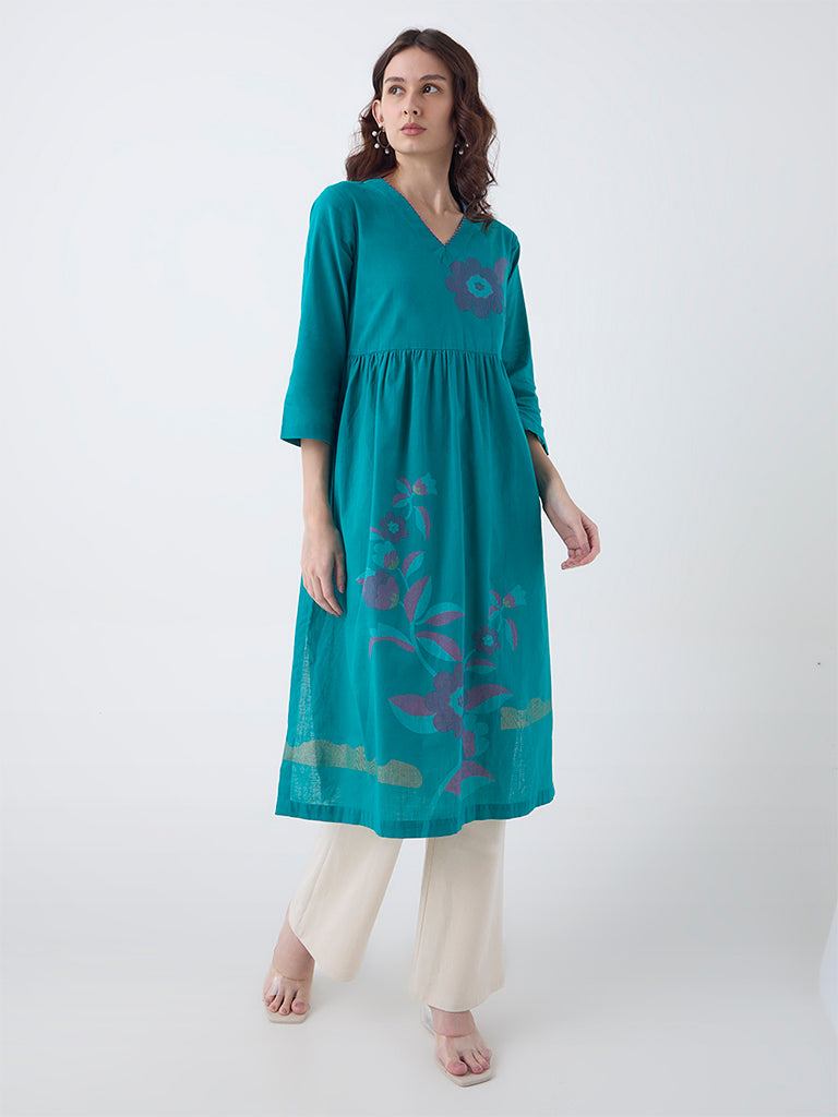 Awaken your ethnic wardrobe with this teal kurta from Utsa. Shaped in a fit-and-flare silhouette. this pure-cotton creation is adorned with intricate floral embroidery at the front. The V-neck and three-quarter sleeves frame the design beautifully. while side pockets lend practicality to this statement piece.