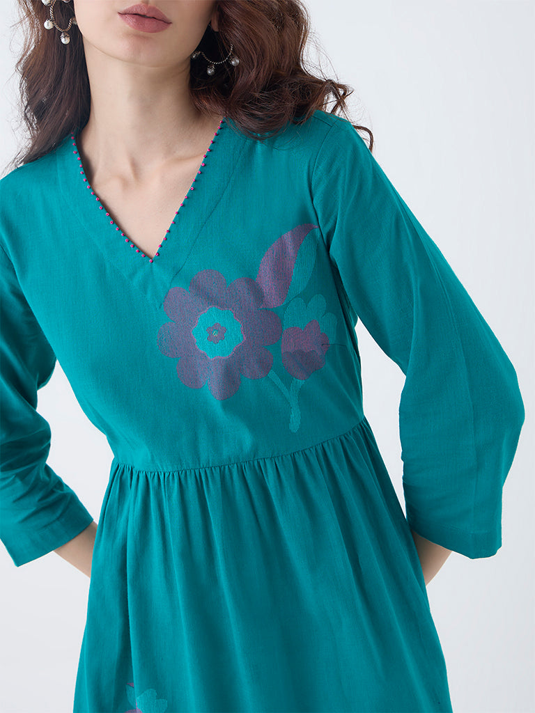 Utsa Teal Floral Embroidered Fit-and-Flare Cotton Kurta
