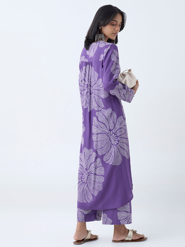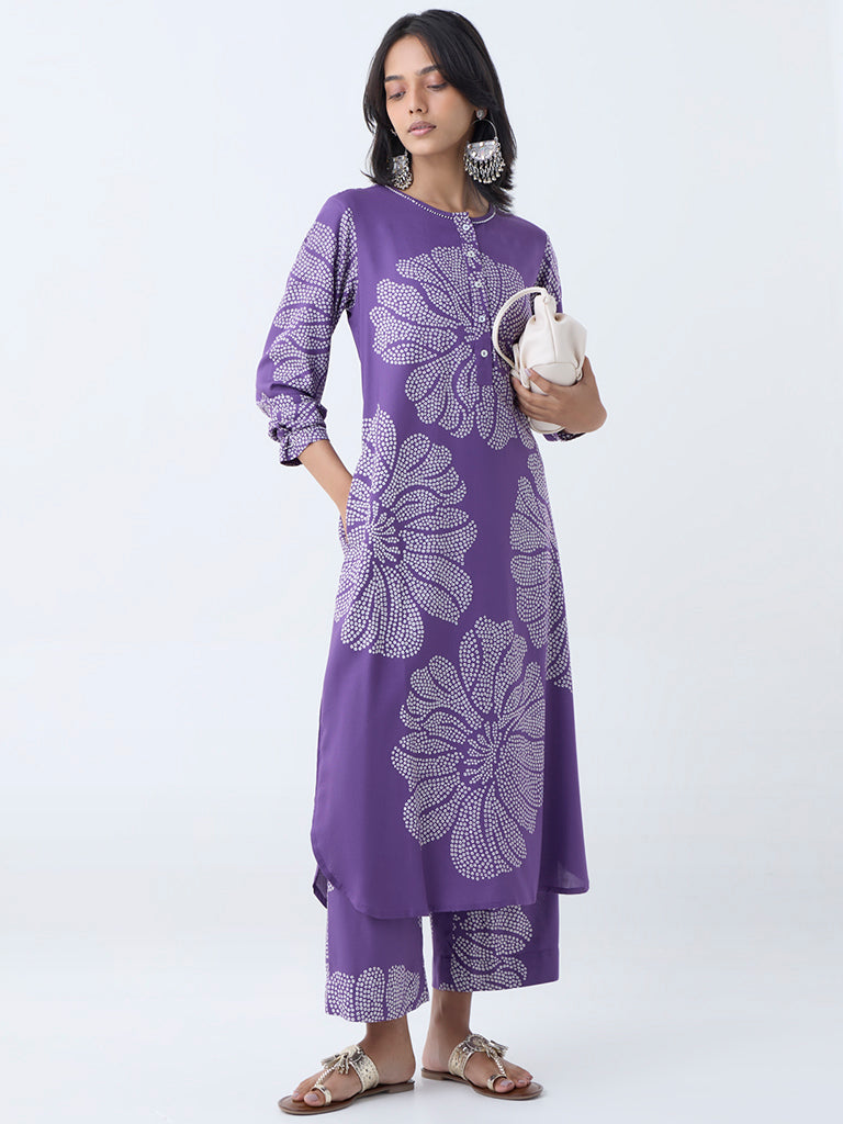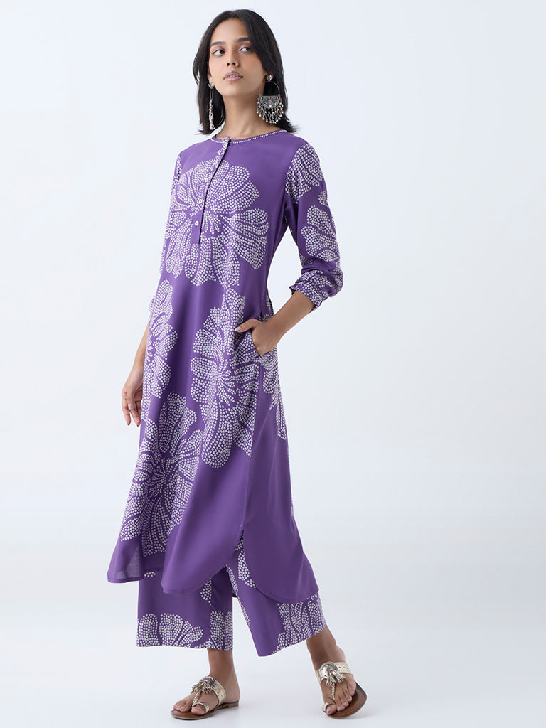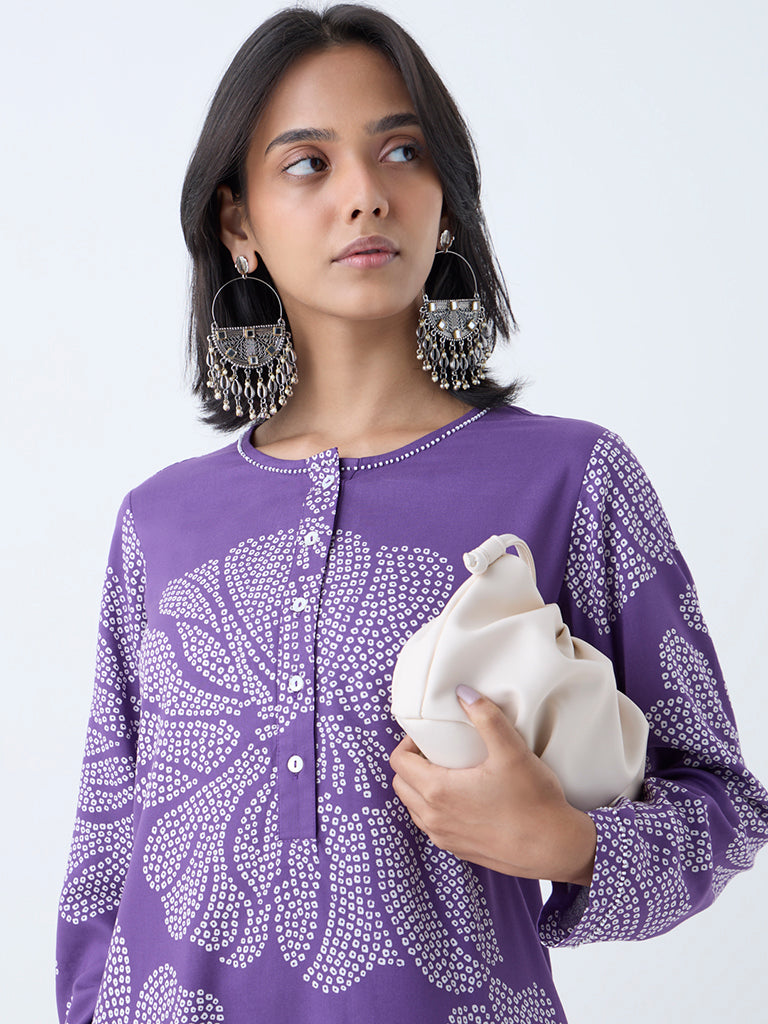 Infuse your festive wardrobe with the rich allure of this violet Bandhani kurta from Utsa. Milled from an ultra-lightweight fabric for easy comfort. it is styled with a round neck. a quarter button placket. and full sleeves for an elegant finish. A practical slip pocket completes the design. blending artisanal detail with everyday ease.